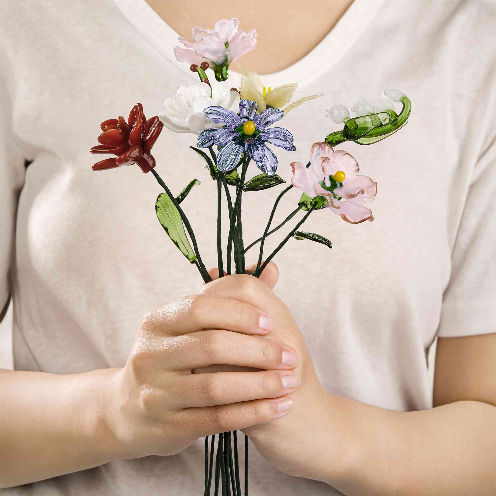 Elaboración artesanal de primera calidad : Cada figura está tallada en vidrio de alta calidad con líneas suaves, pétalos coloridos y un acabado refinado. El ramo se siente ligero pero resistente, con un brillo nítido que capta la luz natural de forma hermosa.