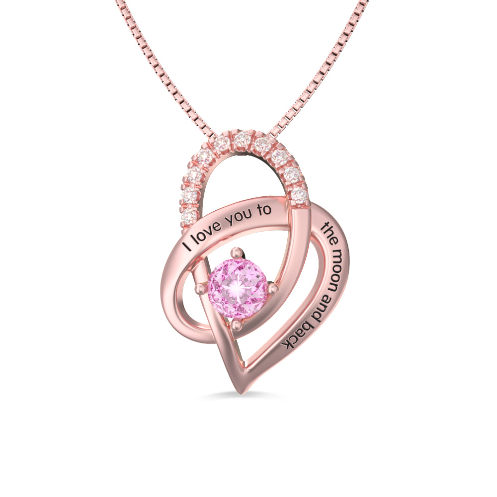 Este encantador collar con la expresión ""I Love You To The Moon and Back"" (algo como ""te quiero hasta el infinito y más allá"") está hecho en plata de ley y simboliza una conexión eterna. Con es mensaje tan dulce, nunca dejará de ponérselo y apreciarlo. Para hacerlo totalmente exclusivo, puede añadir una piedra de nacimiento personalizada al colgante con forma de corazón. Dígale te quiero en más de una forma con este hermoso collar. Derrame amor sobre usted o sobre su ser querido con este colgante de plata con forma de corazón y cuatro exclusivos acabados a mano. El amor expresado con elegancia.