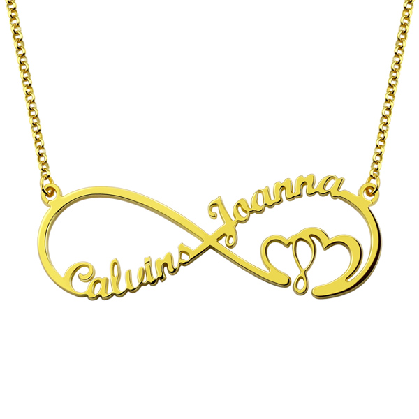 Collar con corazón en corazón, forma de infinito y 2 nombres de plata bañada en oro