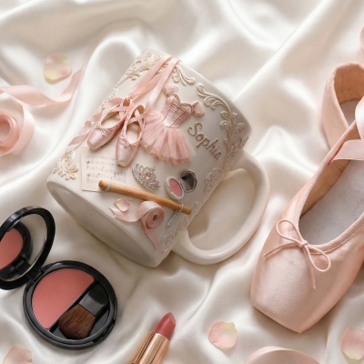 Diseño 3D de tutú de ballet : una taza de cerámica con elementos esculturales en relieve, que incluyen un tutú en capas, zapatillas de punta con cintas, un espejo de mano de ballet y accesorios decorativos para el cabello, todo integrado en el cuerpo con profundidad precisa y transiciones suaves.