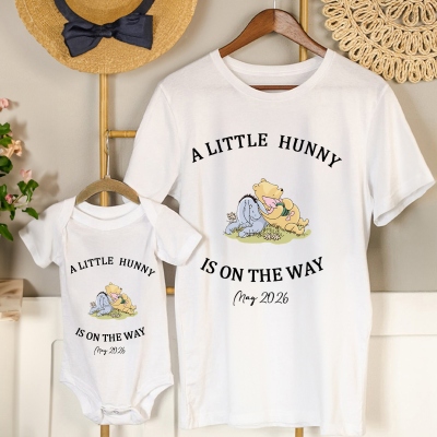 Adorable diseño de Pooh : este conjunto para mamá y bebé presenta una ilustración clásica de Winnie the Pooh con el dulce tema "Un poco de miel", creando un look cálido y divertido. El estilo a juego resalta el vínculo especial entre mamá y bebé, manteniendo el encanto atemporal de los dibujos animados.