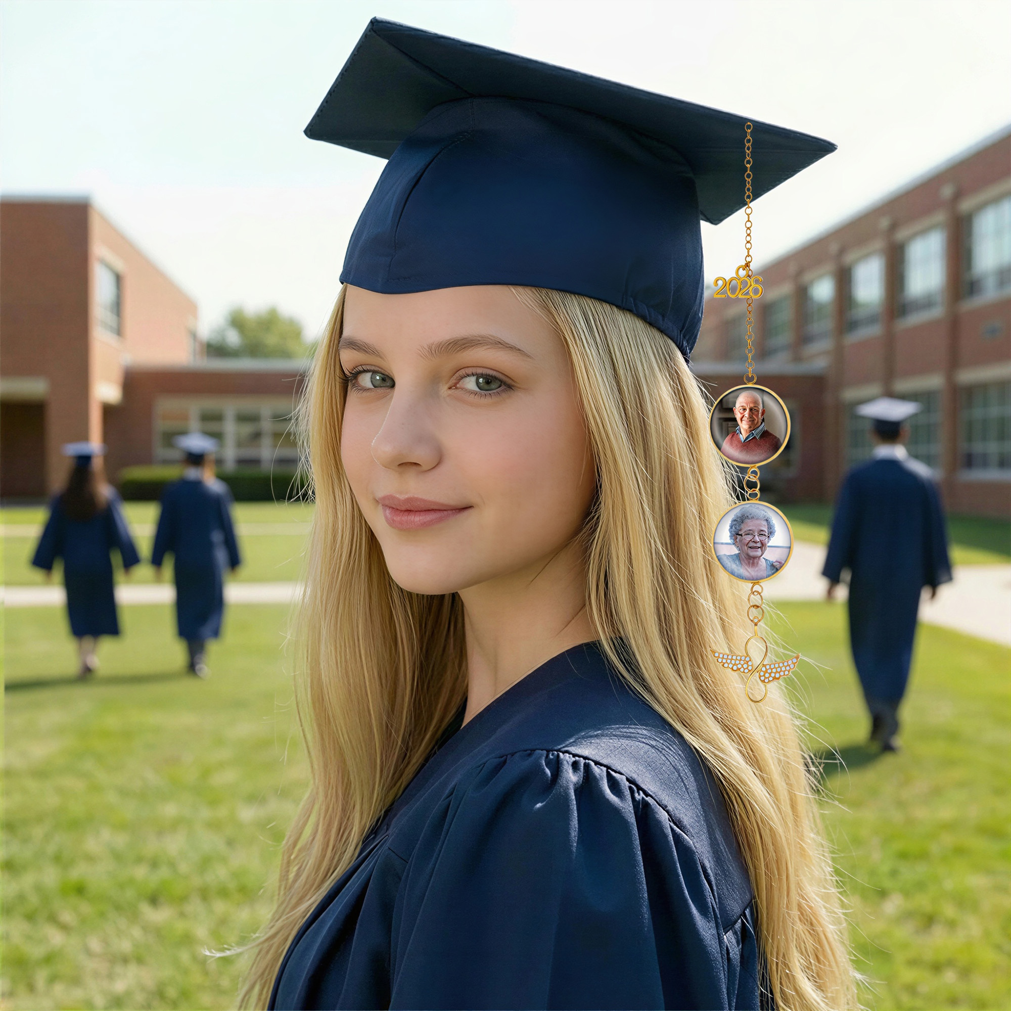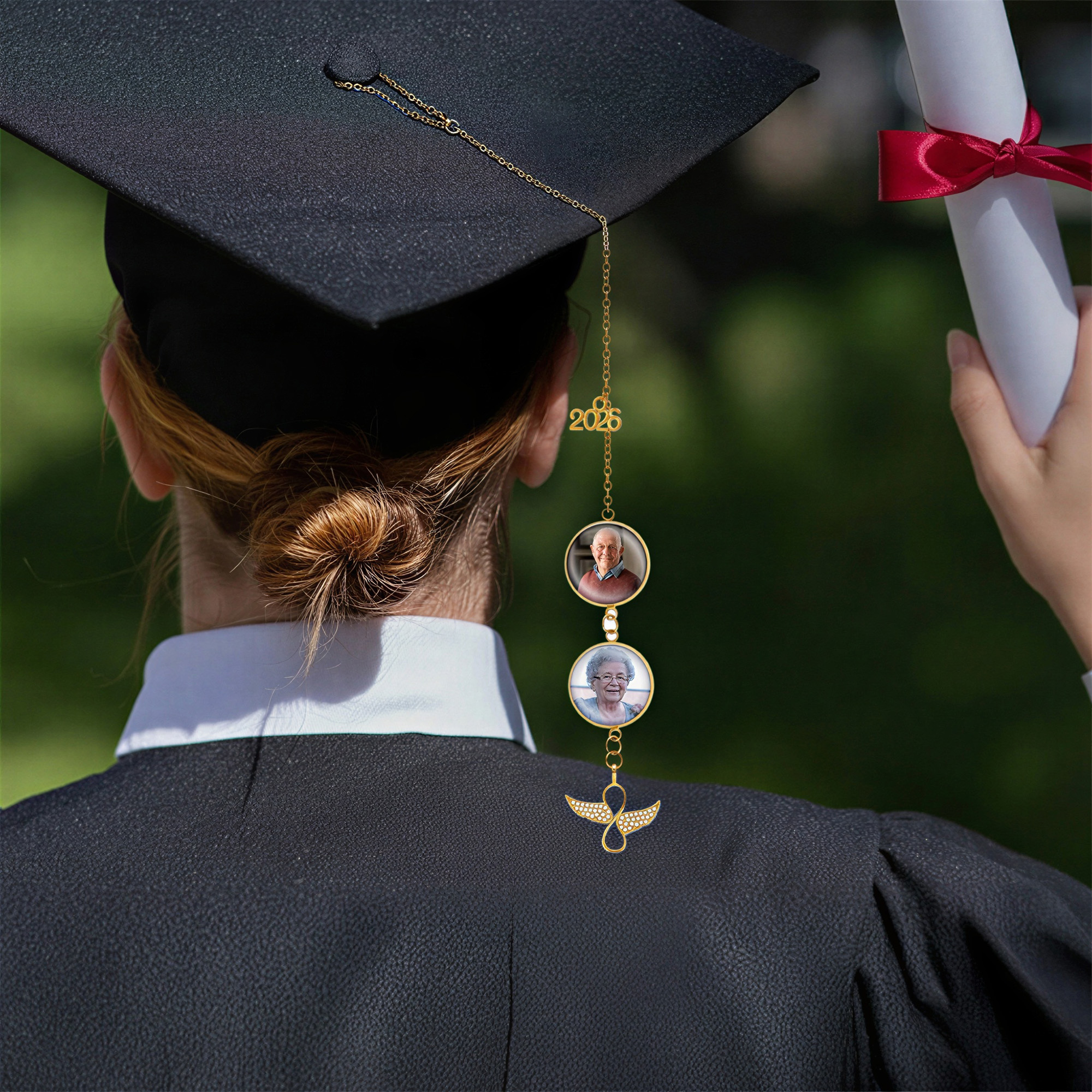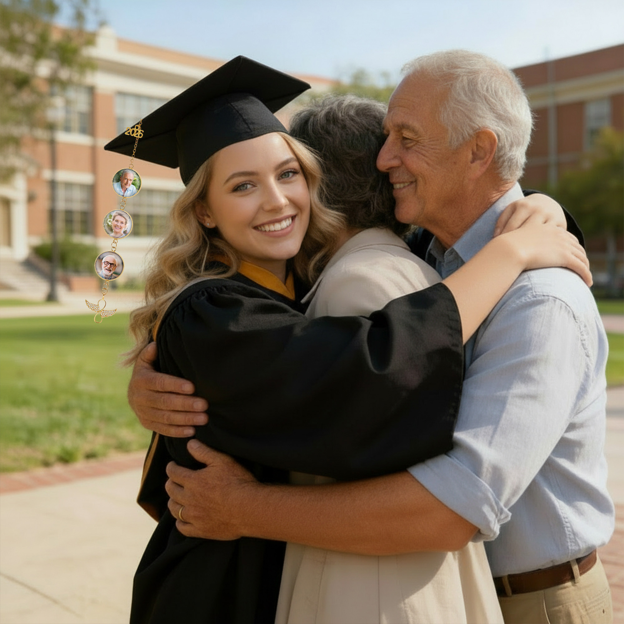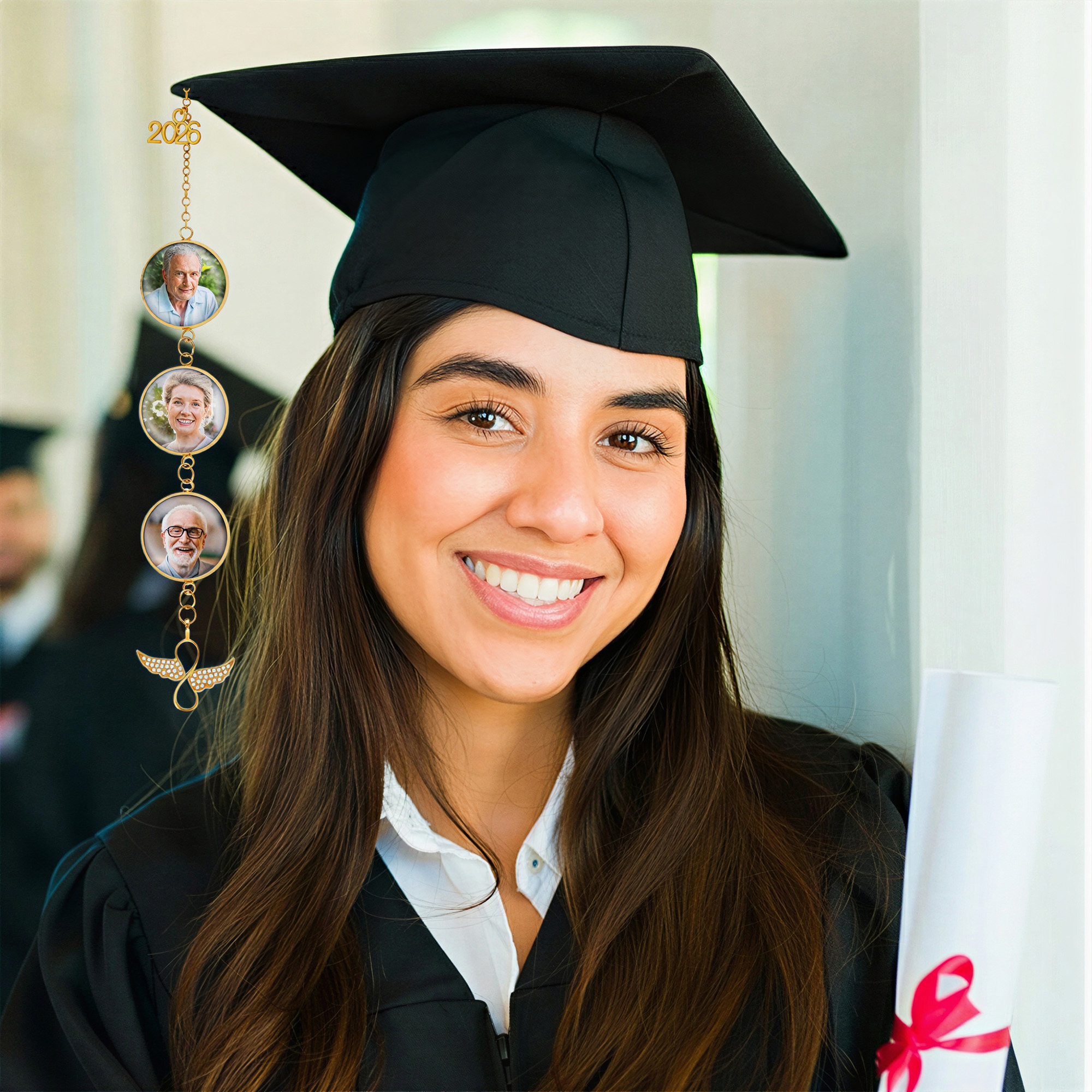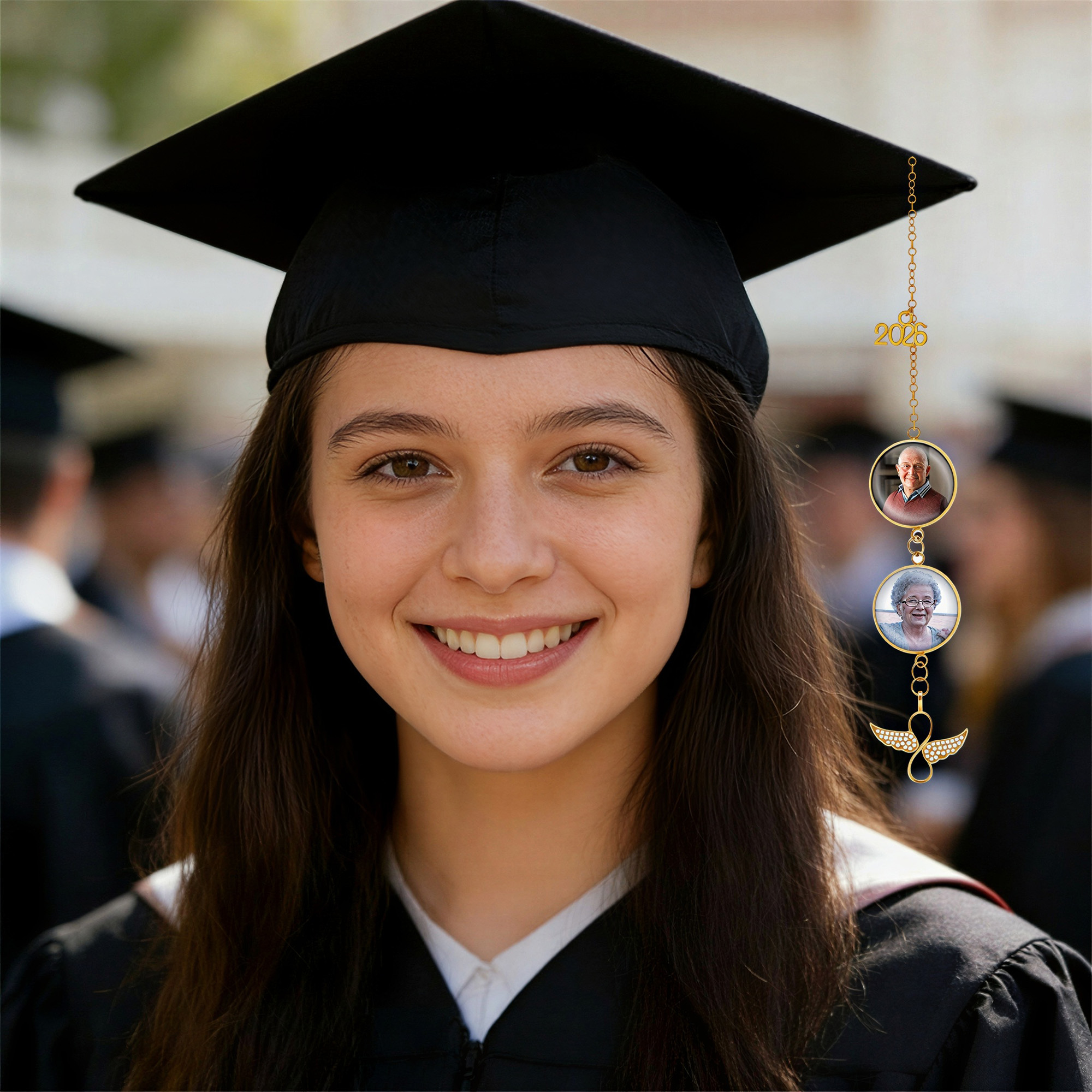 Alas de ángel y dije para birrete : una delicada borla dorada para birrete de graduación con un dije que dice "2026", marcos de fotos circulares y alas de ángel brillantes en la parte inferior, que simbolizan el logro, la protección y el amor duradero en una sola pieza elegante.