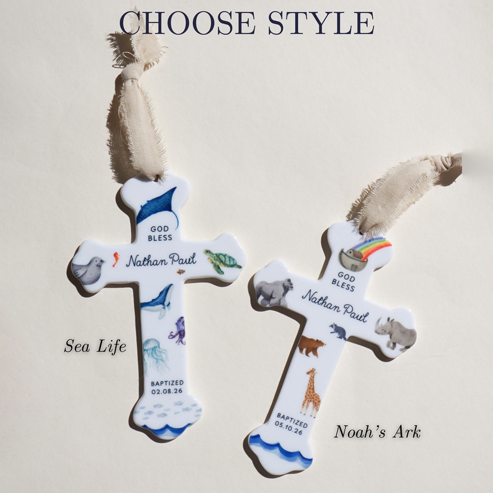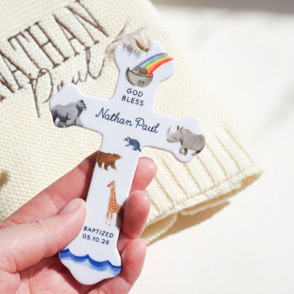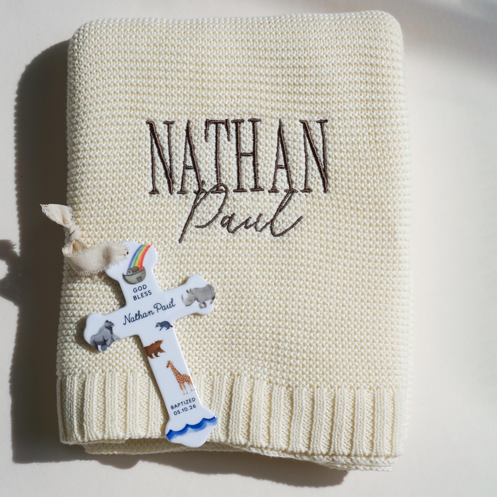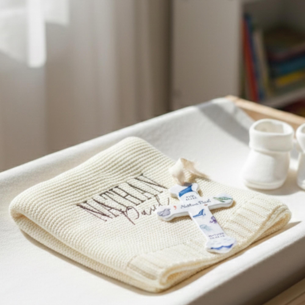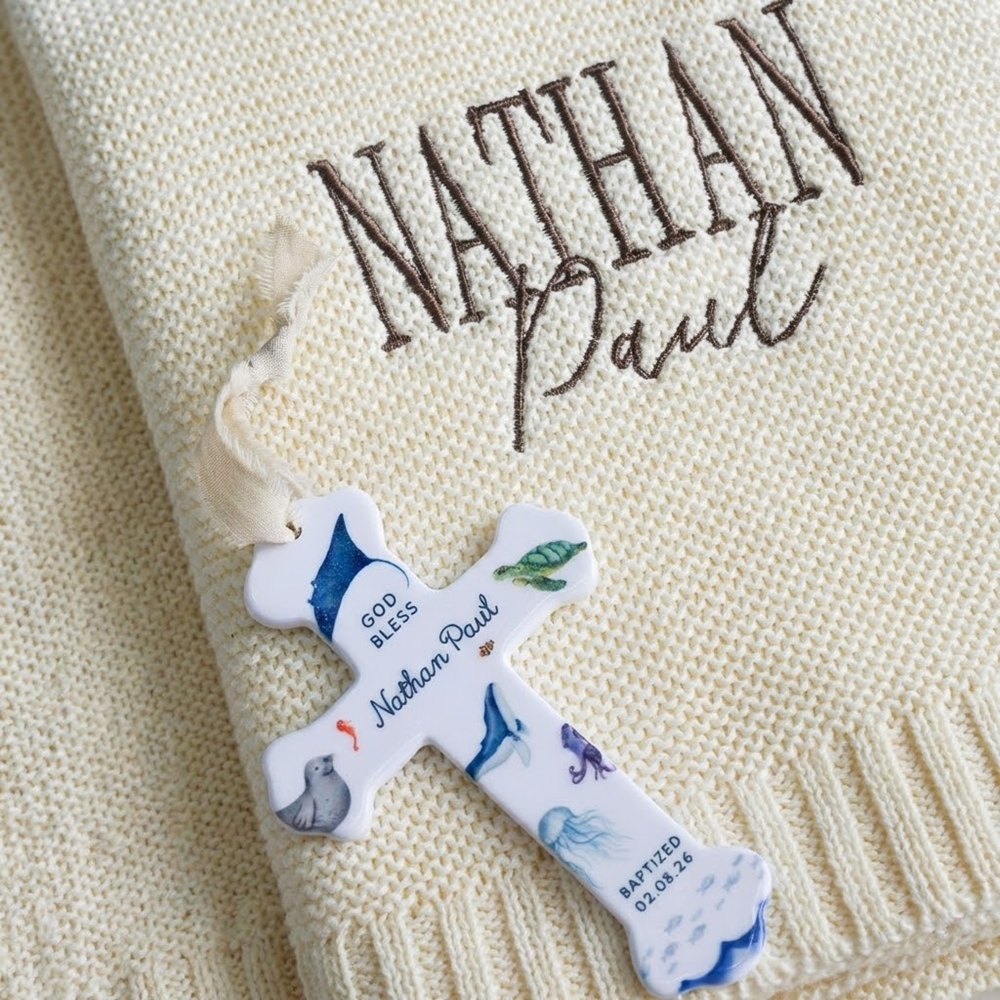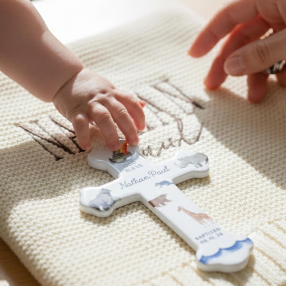 Conjunto de cruz y manta de bautismo : una tierna combinación de una manta de punto bordada a mano y una cruz de cerámica adornada con delicados motivos de animales, elaborada para marcar un comienzo sagrado con reverencia silenciosa y calidez duradera.