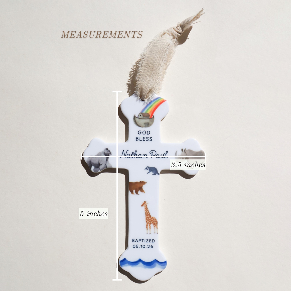 Tejido suave y cerámica con un toque especial : la manta está tejida con hilo de mezcla de algodón de alta calidad, transpirable y acogedora para recién nacidos; la cruz es de cerámica esmaltada, de bordes suaves y ligera, con una cinta para colgarla en la cuna o en una estantería. Los animales están representados en tonos suaves y discretos, de forma simbólica, no literal.