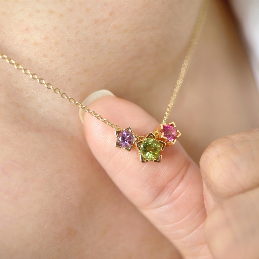 Joyería astrológica personalizable : Este precioso collar luce dijes personalizados que representan los signos solar, lunar y ascendente de quien lo lleva. Personalízalo para que refleje tu perfil astrológico único.