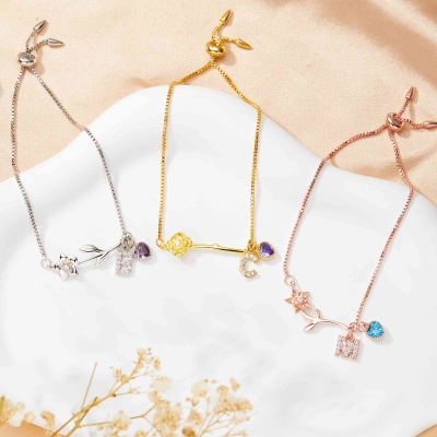 Toque personalizado : elige la flor de nacimiento, selecciona la inicial y elige la piedra de nacimiento en forma de corazón para crear una pulsera que refleje su historia. Cada detalle está diseñado para combinar con su estilo y los momentos que atesora.