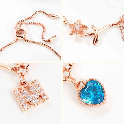 | Estilo | Pulsera personalizada con flor de nacimiento, inicial y piedra de nacimiento en forma de corazón. |