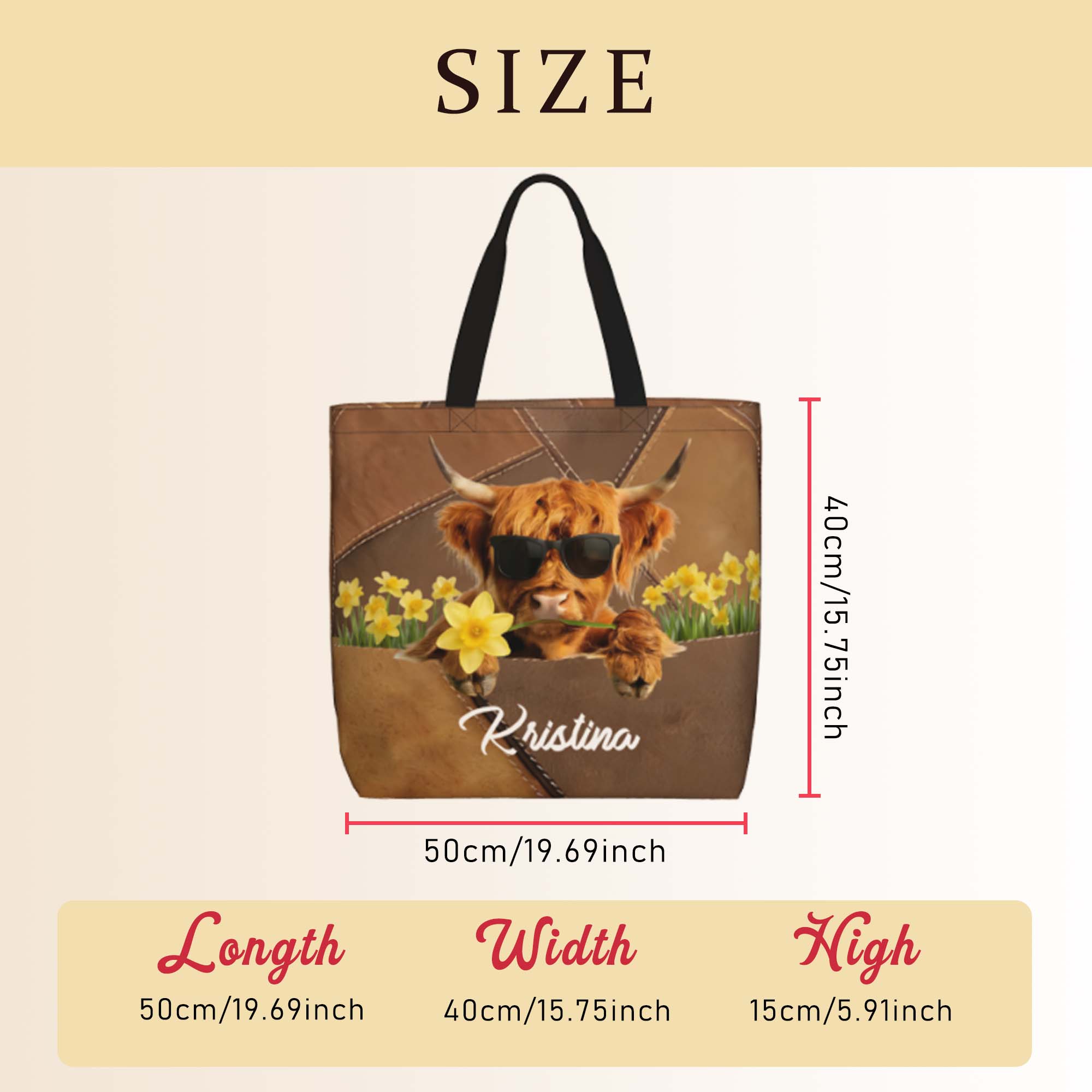 Encanto rústico de las Tierras Altas : Este bolso tote luce una encantadora vaca de las Tierras Altas combinada con delicadas flores de nacimiento, fusionando un toque floral sutil con un estilo campestre. Su estilo vaquero relajado le aporta personalidad, manteniendo un diseño cálido y llamativo para el día a día.