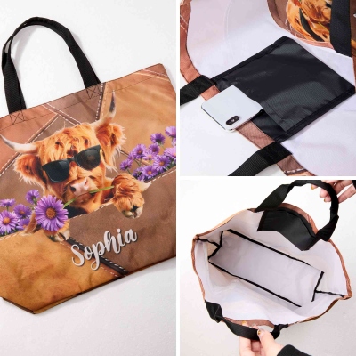 | Estilo | Bolso de mano personalizado con nombre, flor de nacimiento y vaca de las Tierras Altas |