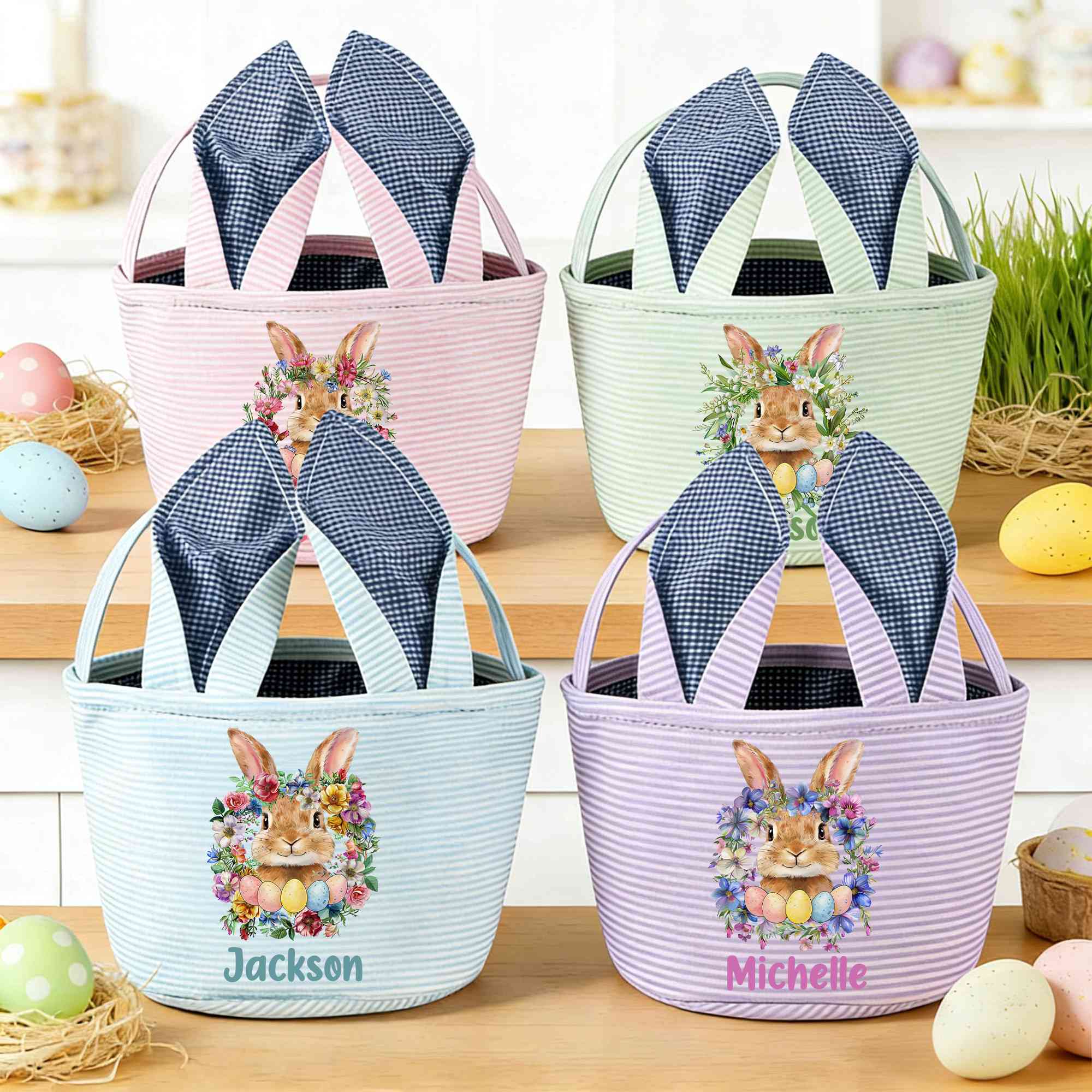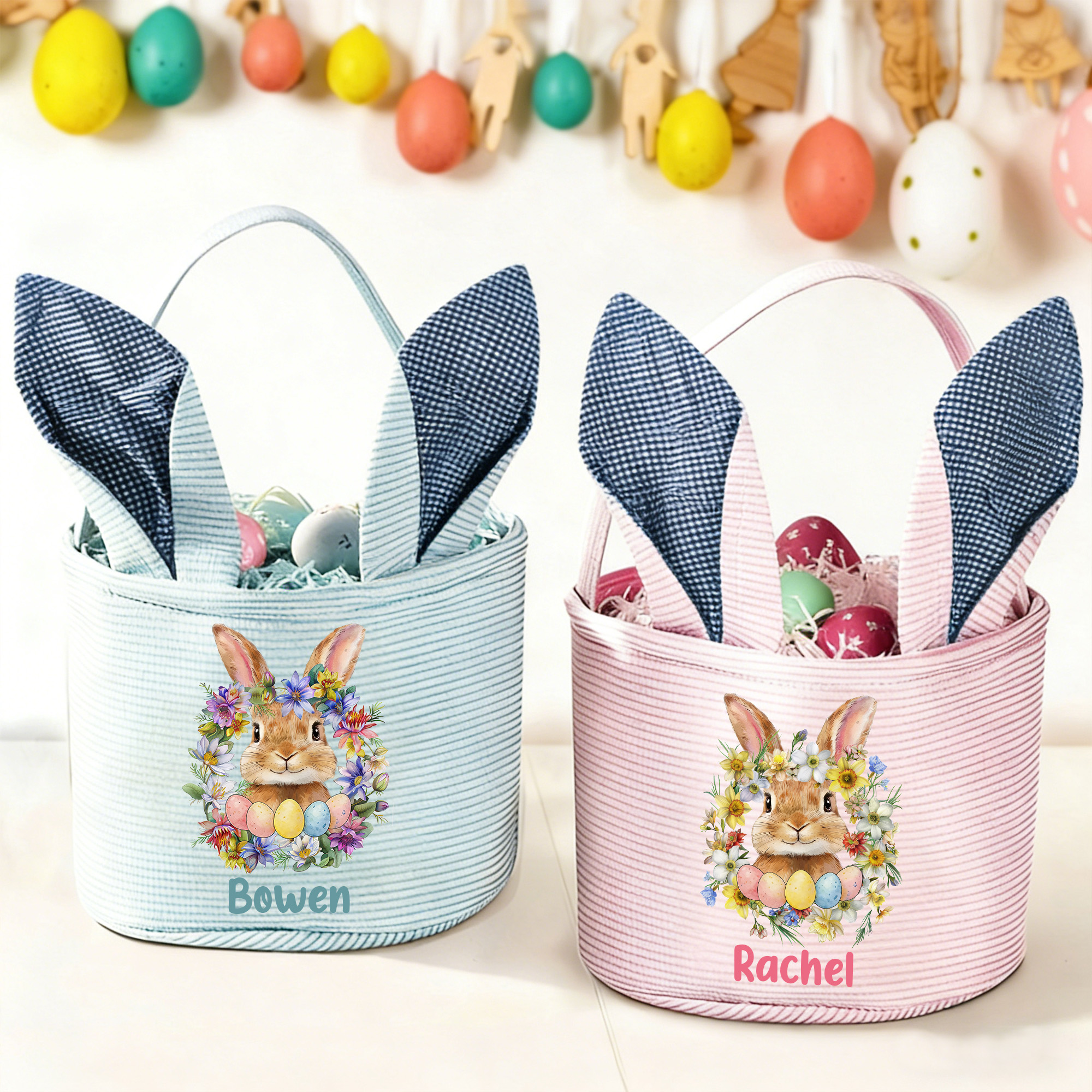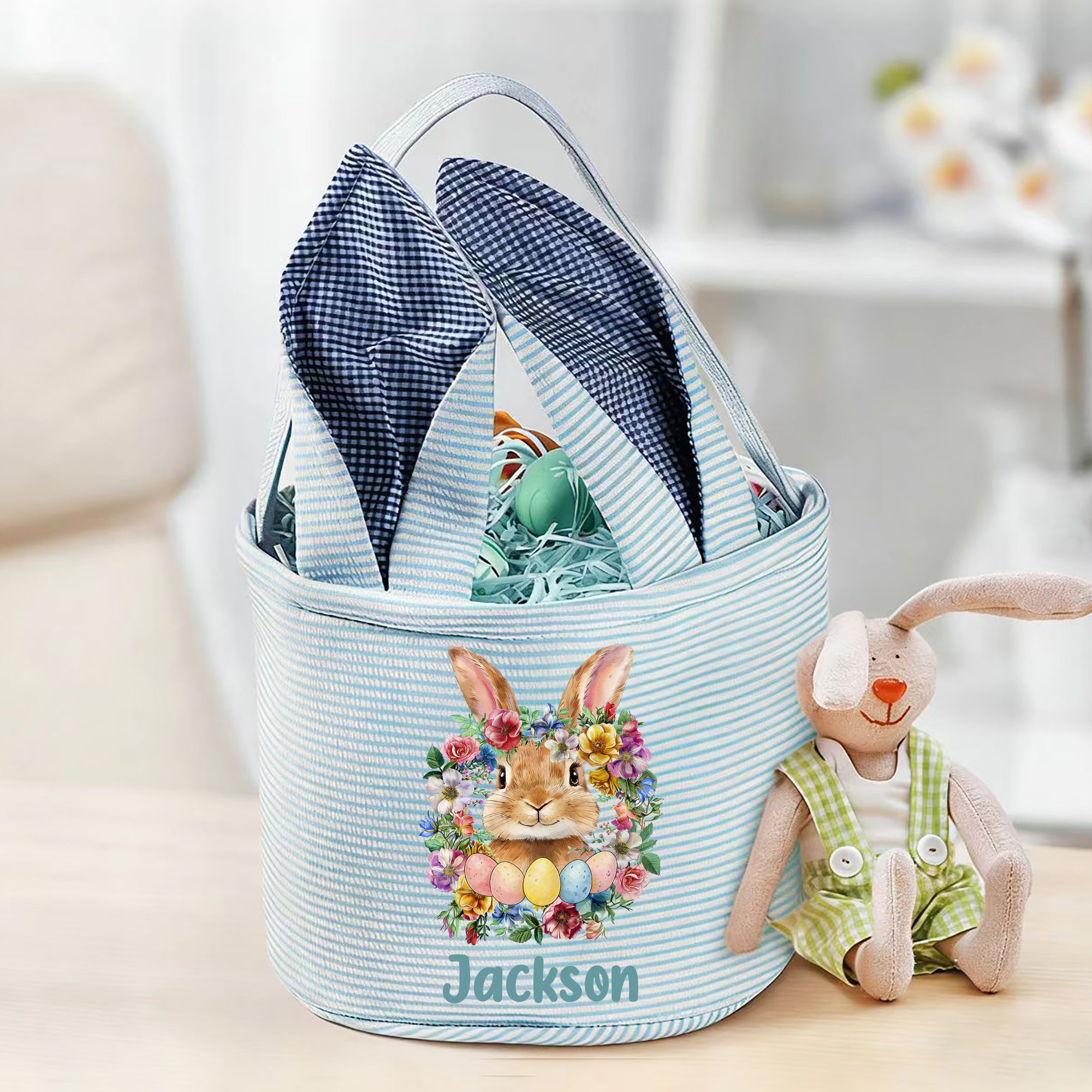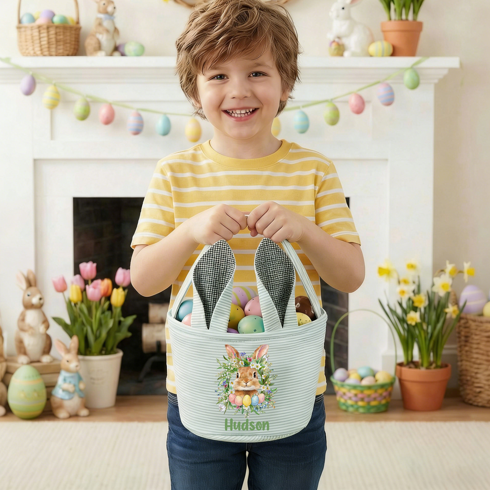 | Estilo | Canasta de Pascua con conejito con orejas de conejo, personalizada con flor de nacimiento y nombre |