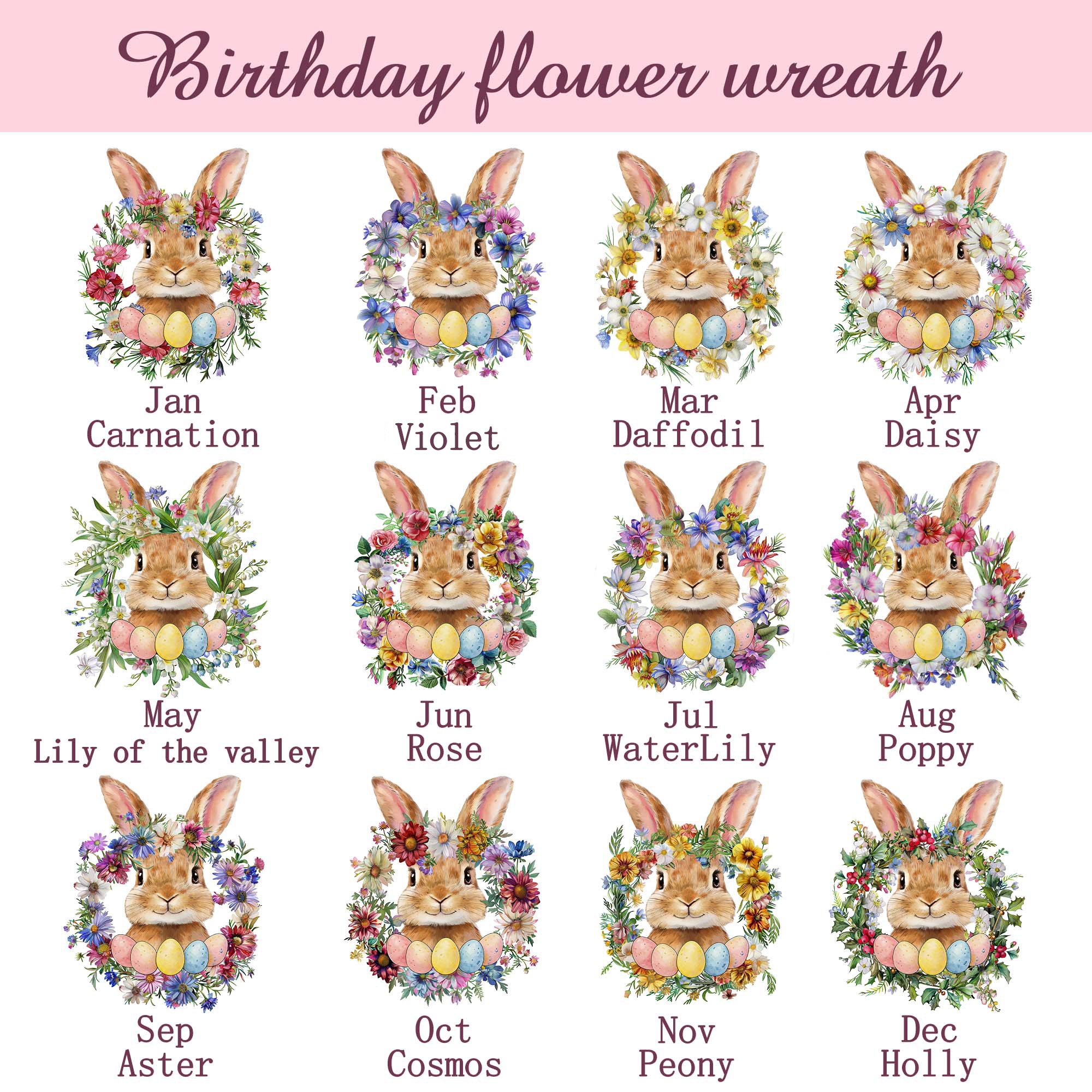 Diseño de canasta de conejito con flores de nacimiento : Esta canasta de Pascua presenta un alegre conejito con una delicada corona hecha con la flor de tu mes de nacimiento. Combinada con huevos pastel y suaves colores primaverales, el diseño combina un significado personal con un toque festivo.