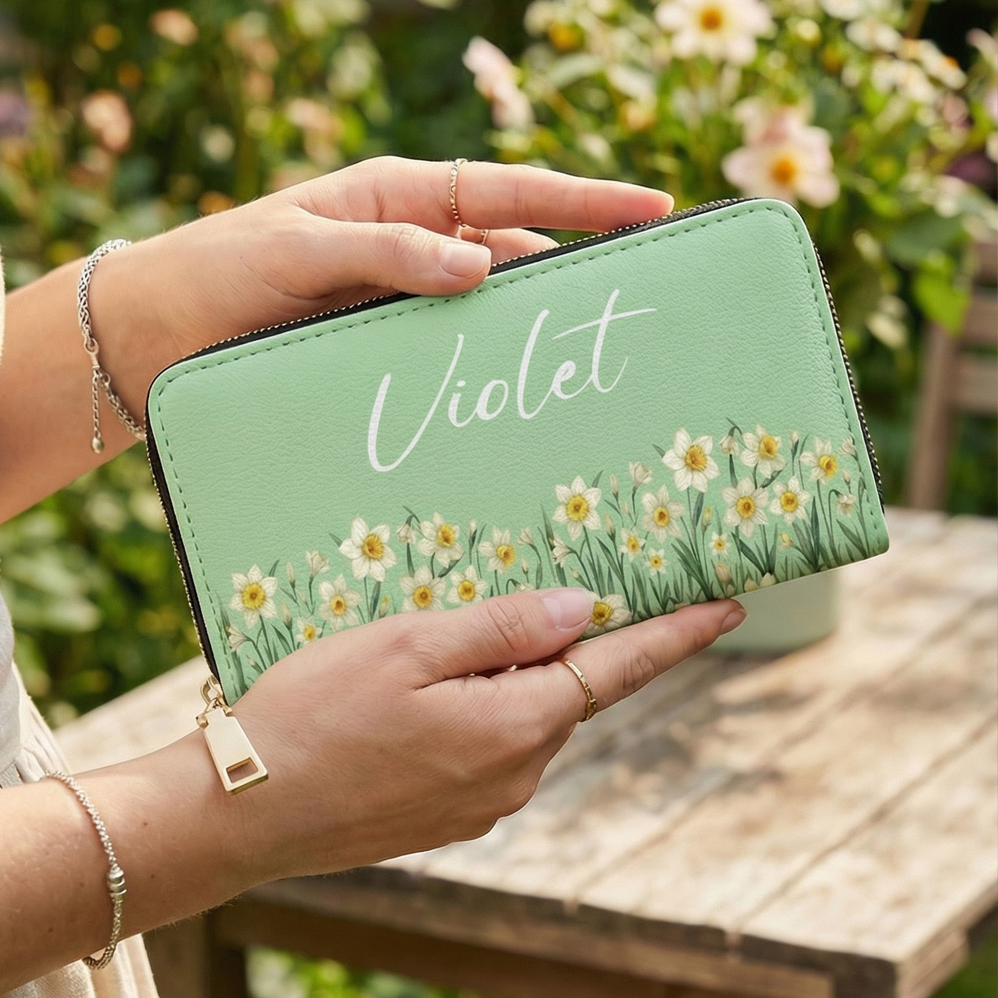 Diseño personalizado con la flor de nacimiento : esta cartera con cremallera luce un precioso estampado de la flor de nacimiento junto con un nombre personalizado, creando un accesorio elegante y significativo. El diseño floral le aporta un toque delicado y elegante, mientras que su forma de cartera de mano estilizada ofrece un estilo clásico ideal para el día a día.