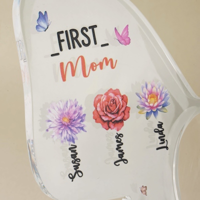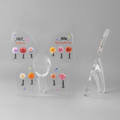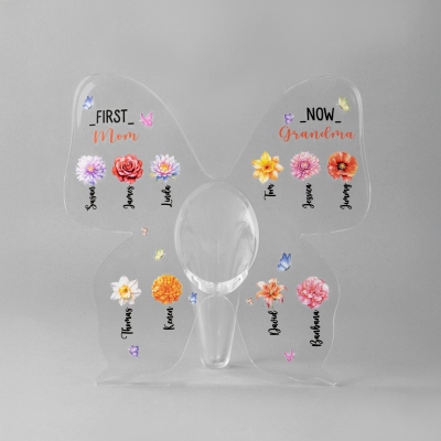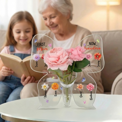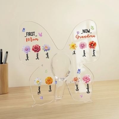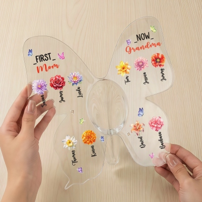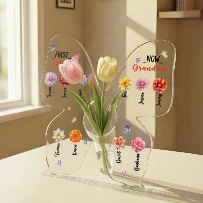 Diseño elegante y personalizado : este jarrón de acrílico está cuidadosamente personalizado con delicados diseños de flores de nacimiento, títulos personalizados y nombres para 1 a 10 hijos o de 1 a 15 nietos. Su forma de mariposa y su acabado en acrílico transparente le confieren un aspecto suave y elegante, mientras que los detalles familiares personalizados lo transforman en un valioso recuerdo decorativo que celebra el amor y la unión familiar.