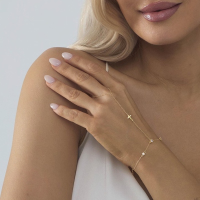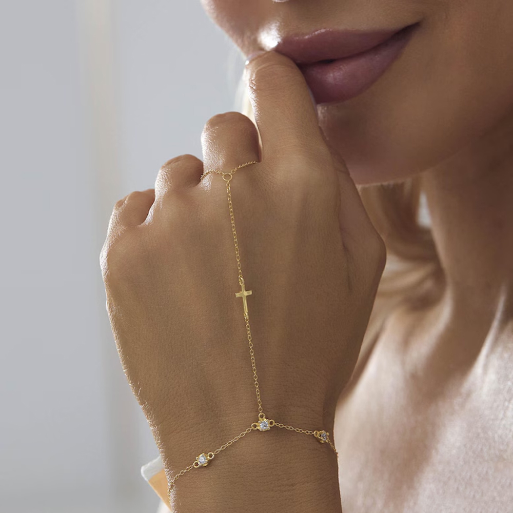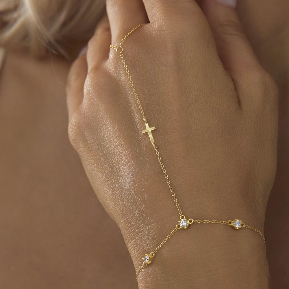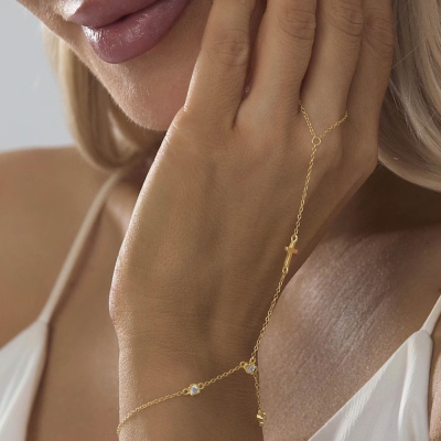 Diseño único : Esta cadena de mano con cruz y piedra natal personalizada combina elegancia y creatividad, con un delicado diseño de cruz unido a un anillo. Es una hermosa manera de expresar la fe y el estilo personal.