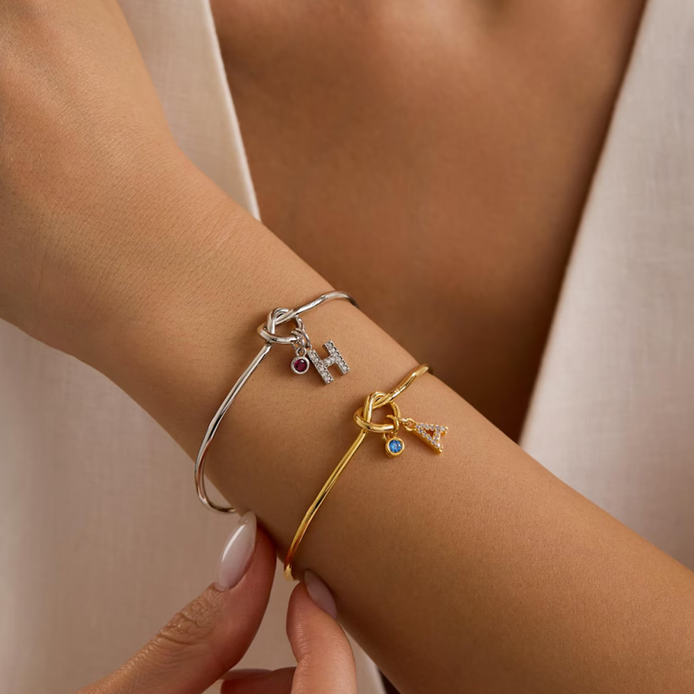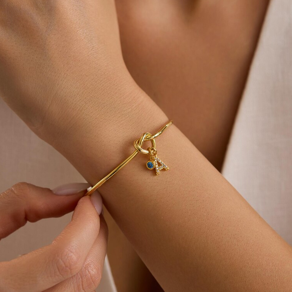 Pulsera "Ata el Nudo" : Un delicado brazalete con un diseño anudado que simboliza la unidad y el amor. Incluye un dije con letra y un colgante con piedra de nacimiento, que le aportan un significado personal a su elegante diseño.