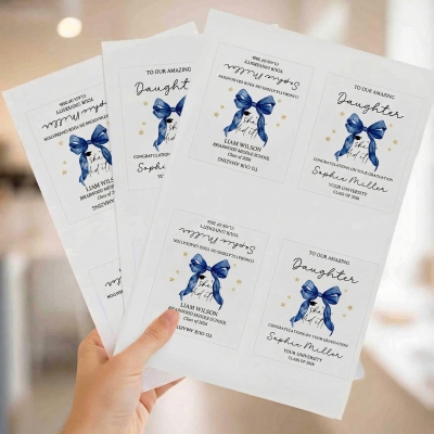 Diseño único con lazo : esta pegatina para vino de graduación está diseñada con un delicado lazo de acuarela, un pequeño detalle de birrete y el alegre mensaje "¡Lo logró!" que le da un toque festivo. Se puede personalizar completamente con el nombre del graduado, la escuela y el año de graduación, creando un diseño único. Disponible en cuatro tamaños, se adapta a la mayoría de las botellas de vino y transforma fácilmente una botella sencilla en un recuerdo especial para celebrar.