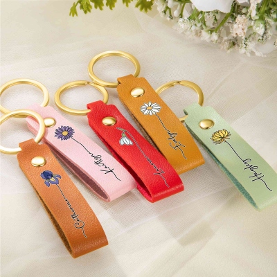 Llavero personalizado de flor de nacimiento colorida con nombre, llavero de cuero sintético, regalo de despedida de soltera, regalo de cumpleaños o boda para ella, damas de honor o mujeres.