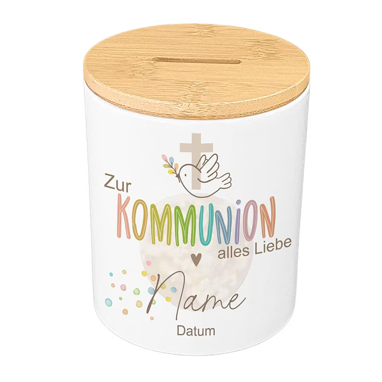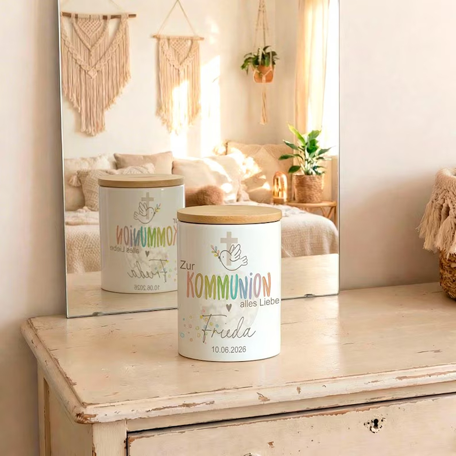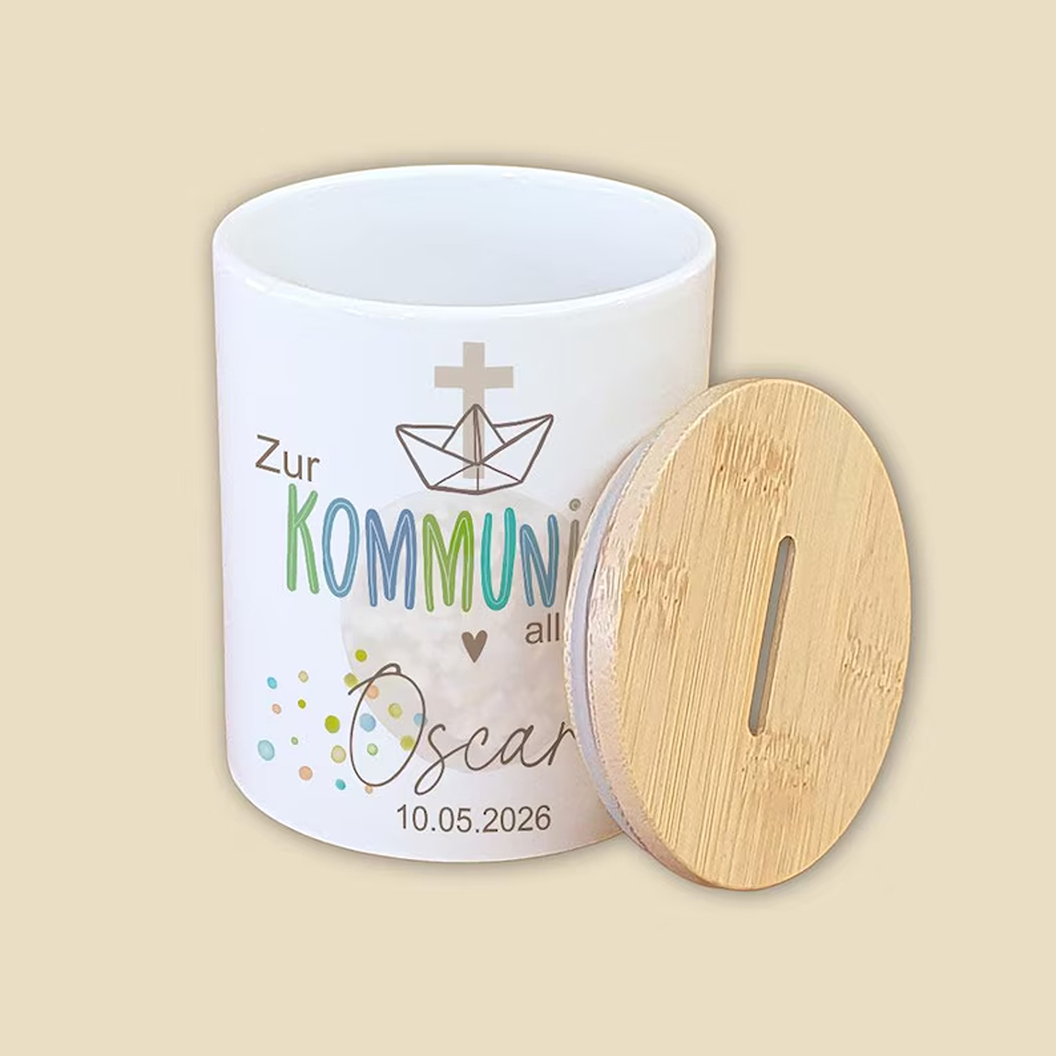 Tarro de los deseos para la Primera Comunión : una caja de cerámica para guardar dinero con tapa de madera natural, decorada con delicados motivos dibujados a mano y personalizada con nombre y fecha, diseñada para guardar monedas, billetes o pequeños obsequios con silenciosa reverencia y alegría.