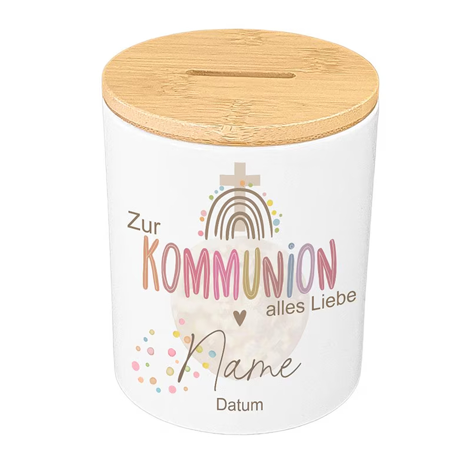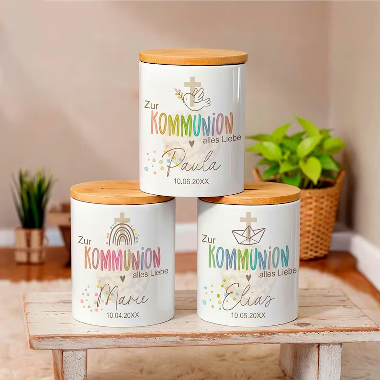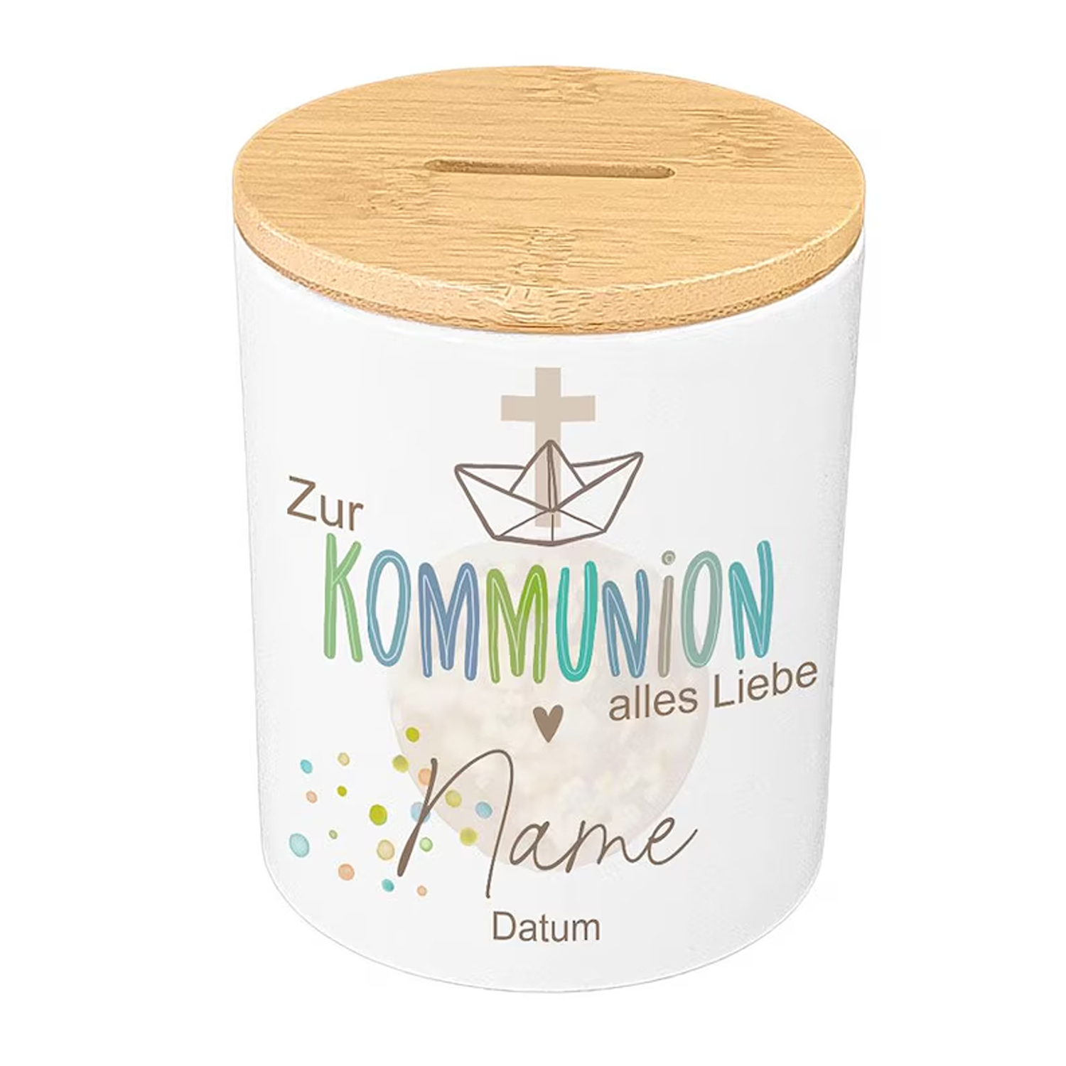 Tarro de los deseos para la Primera Comunión : una caja de cerámica para guardar dinero con tapa de madera natural, decorada con delicados motivos dibujados a mano y personalizada con nombre y fecha, diseñada para guardar monedas, billetes o pequeños obsequios con silenciosa reverencia y alegría.