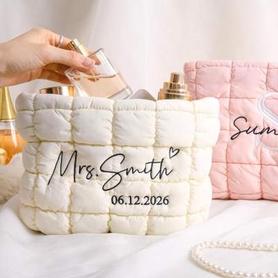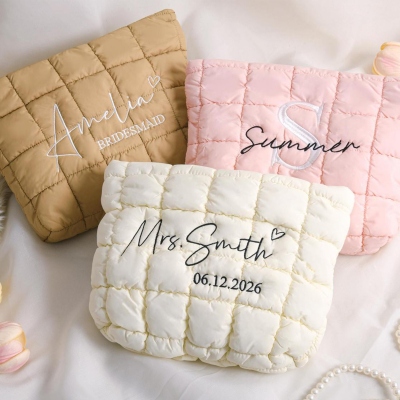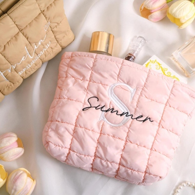 Neceser acolchado : Un neceser suave y acolchado con nombre o monograma personalizado, diseñado para guardar tus artículos esenciales con estilo. Su elegante textura y sus cuidados detalles lo convierten en el complemento perfecto para el día a día o para ocasiones especiales.