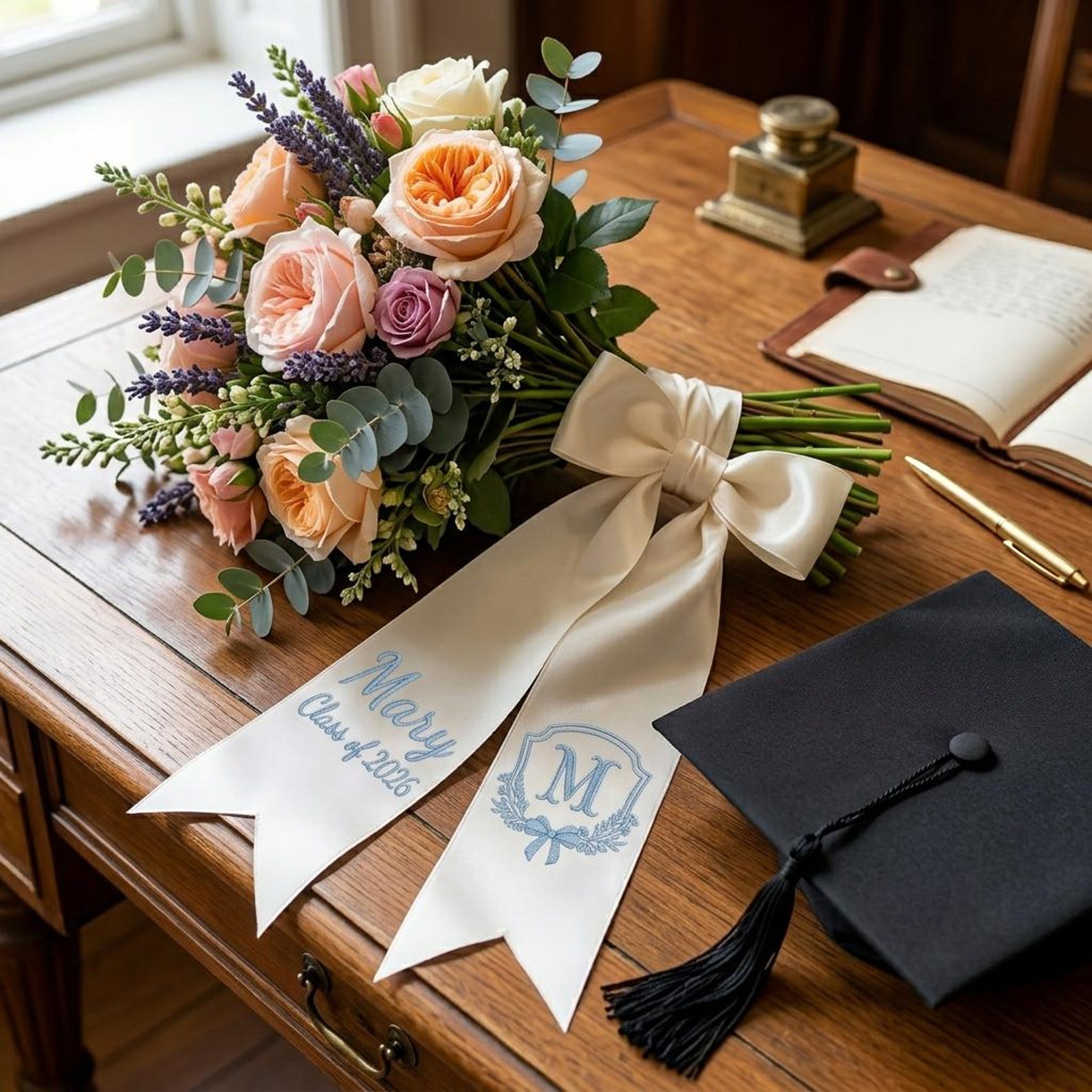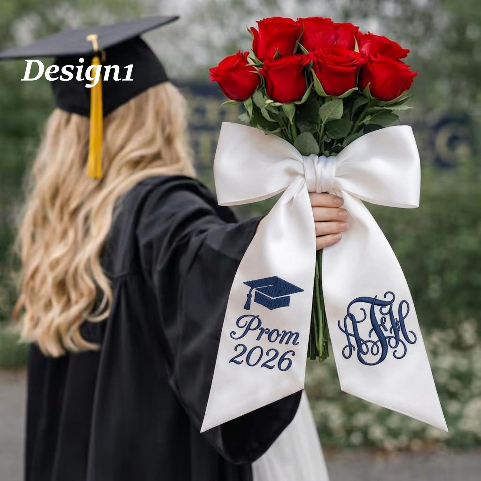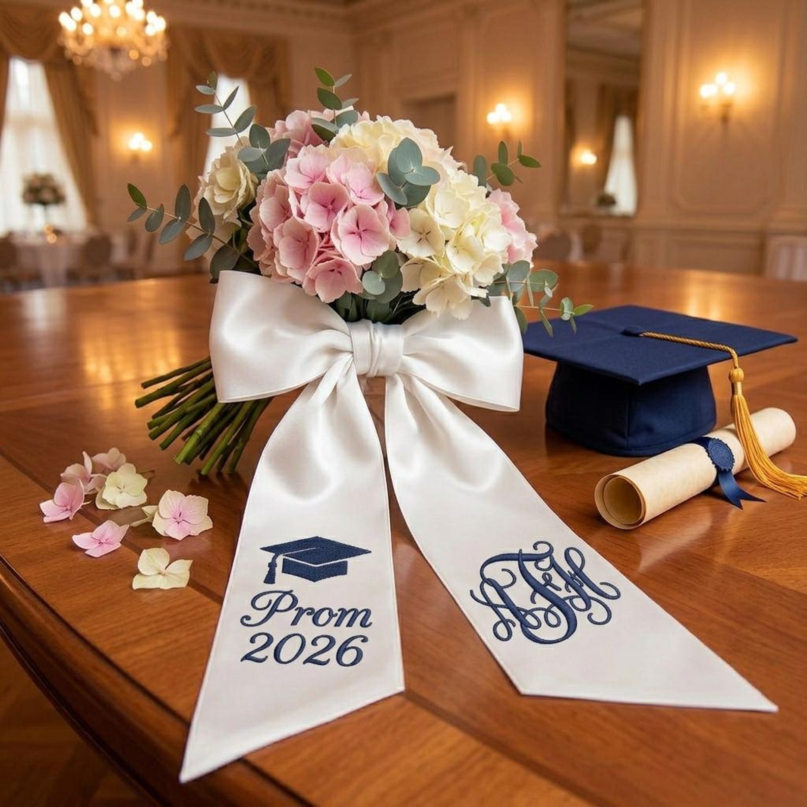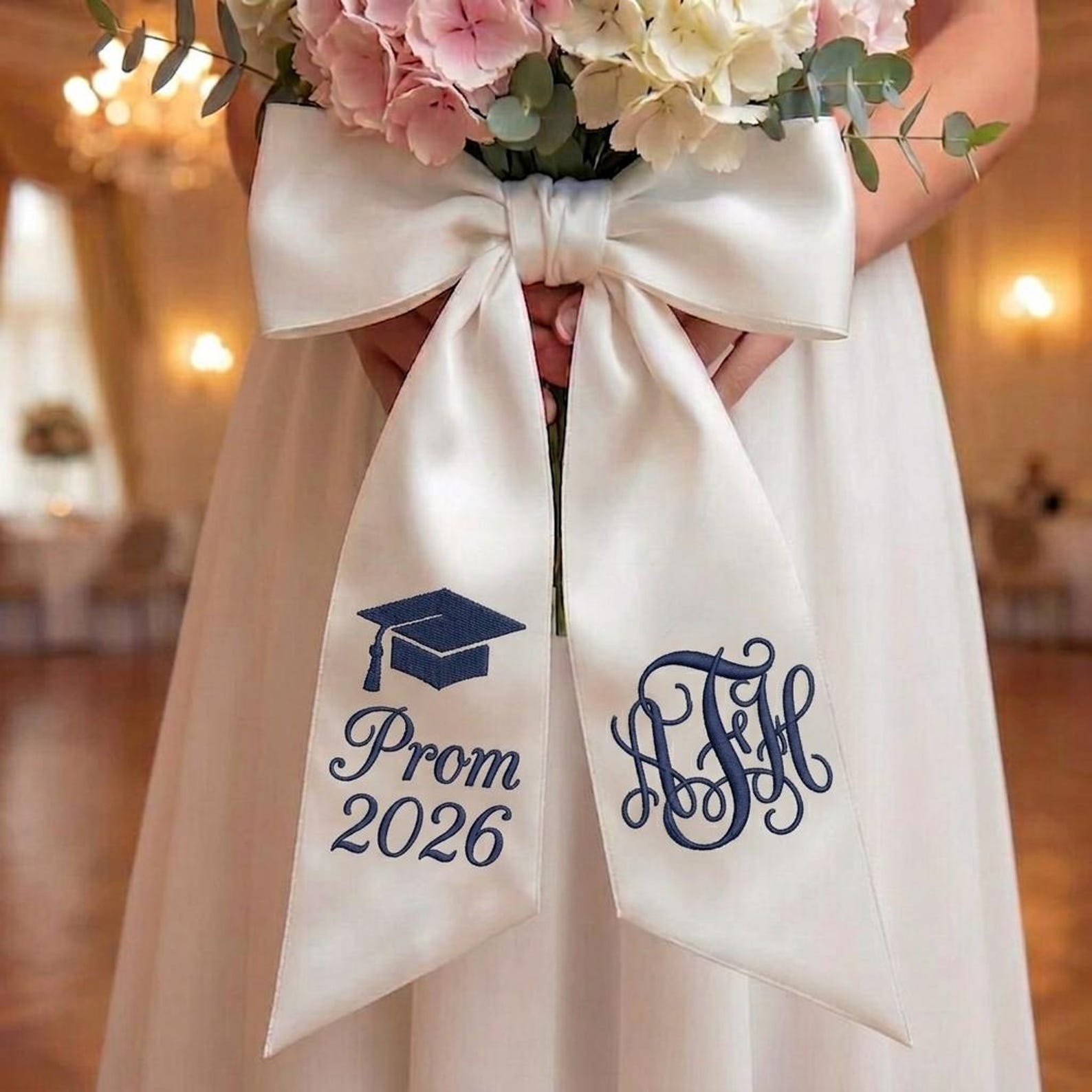 Lazo de satén de lujo : una cinta ancha de satén color marfil atada en un lazo voluminoso y con volumen, con un bordado nítido del icono de un birrete de graduación, "Prom 2026" y un monograma o nombre clásico, todo cosido con hilo resistente para una elegancia duradera.