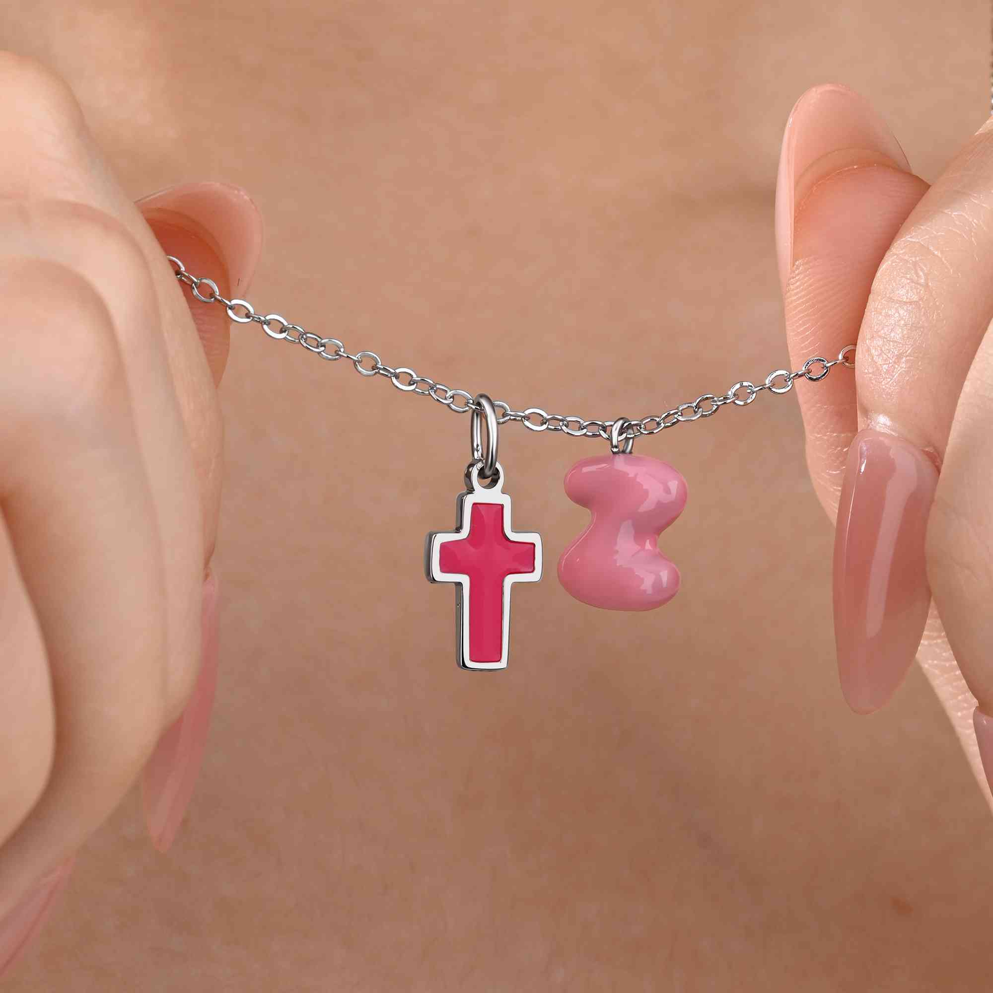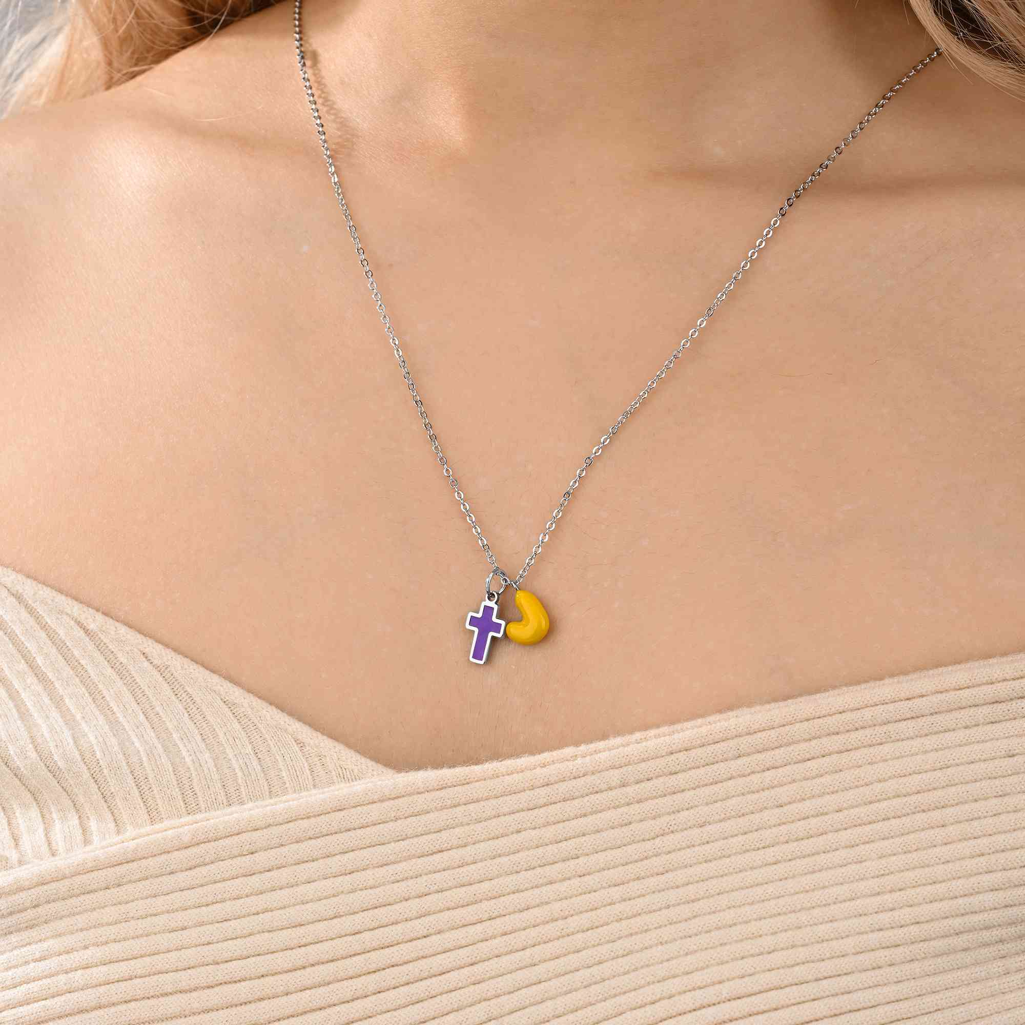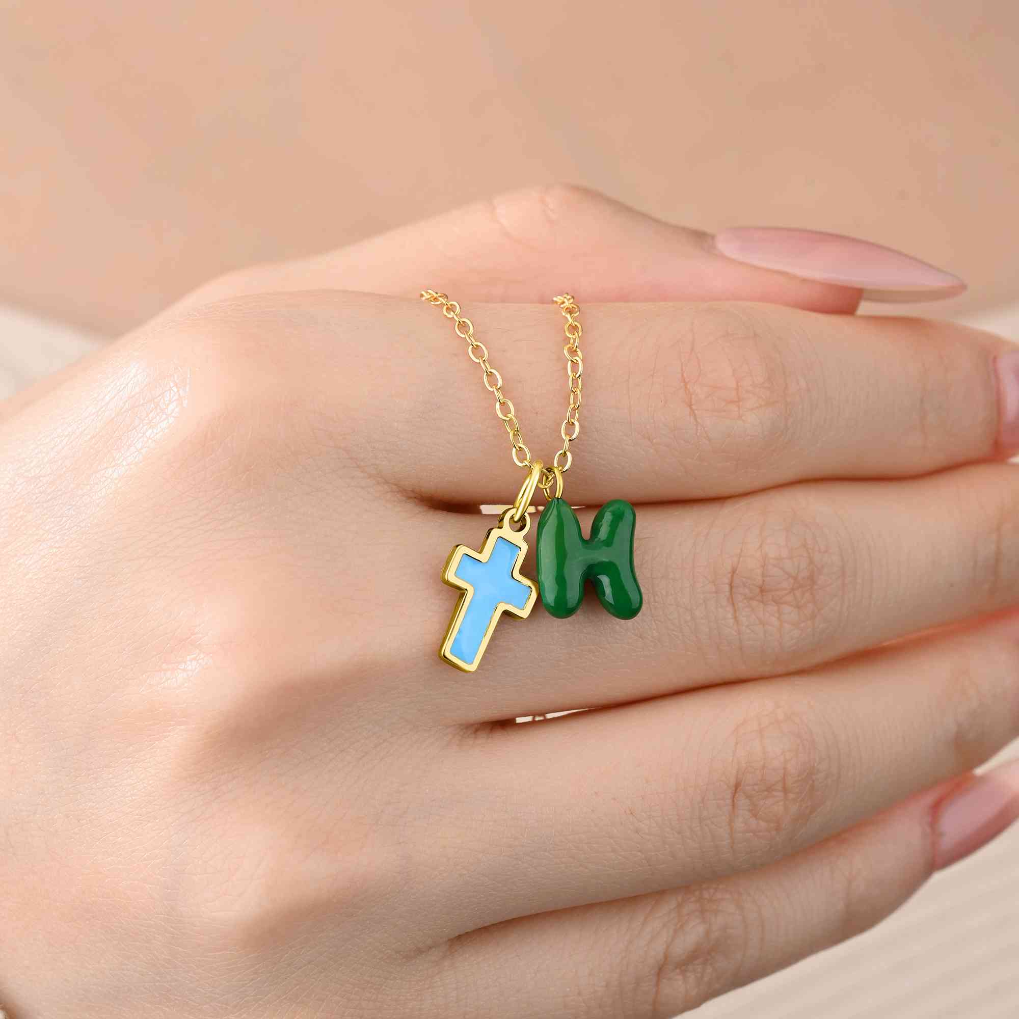 Diseño inspirado en la fe : este collar con cruz de esmalte presenta un símbolo cristiano clásico combinado con una divertida letra burbuja, fusionando el significado espiritual con un estilo fresco y colorido que resulta a la vez moderno y personal.