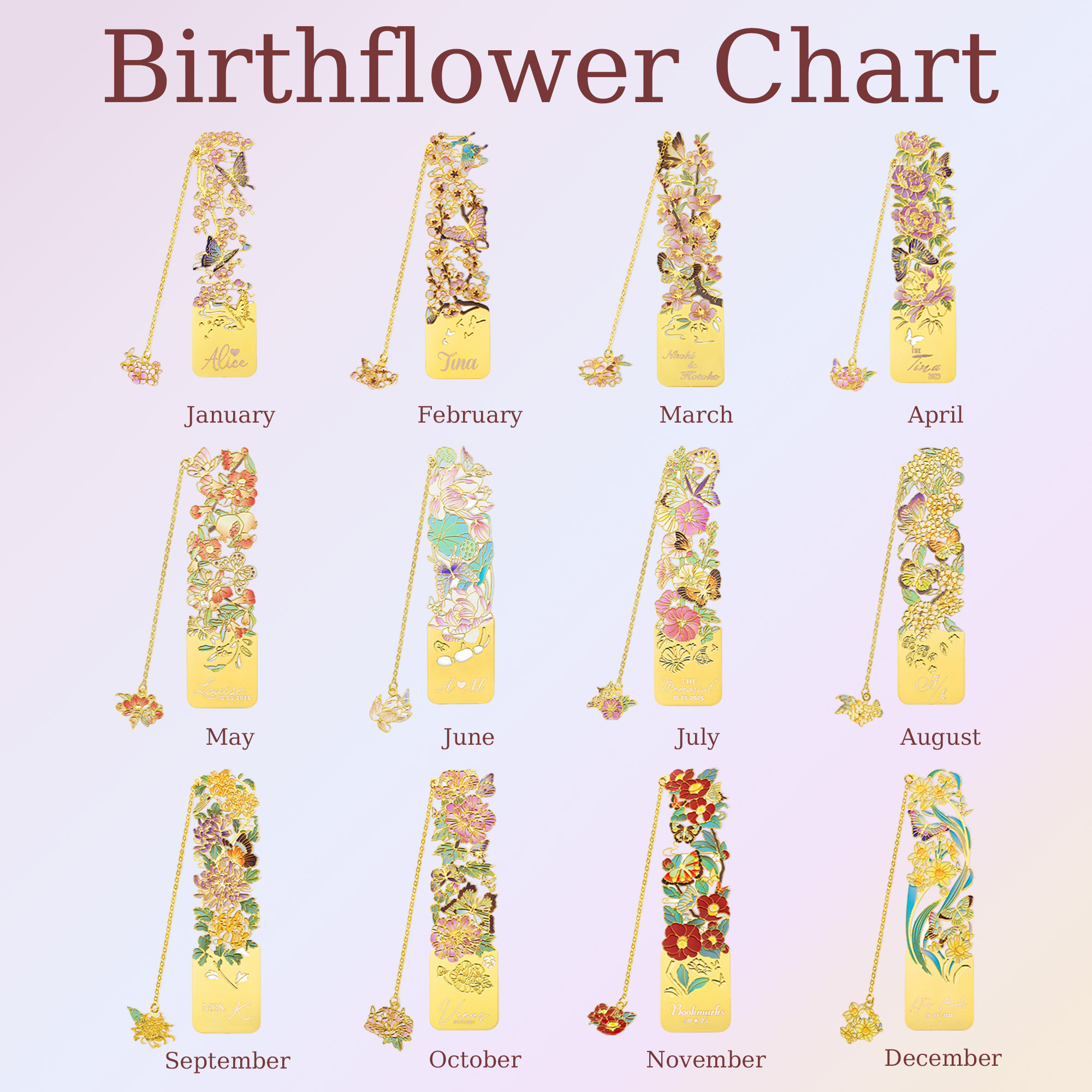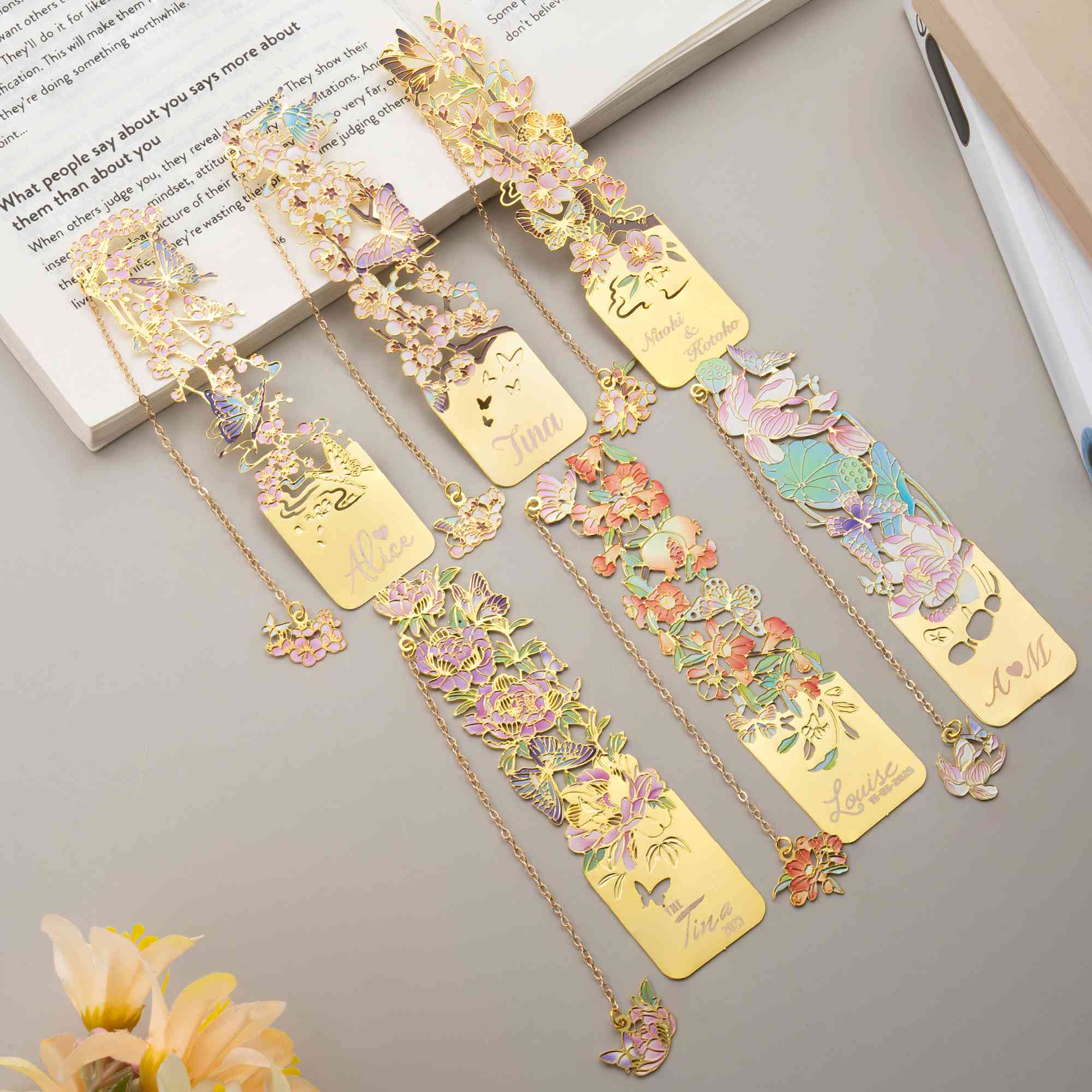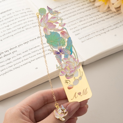 | Estilo | Marcapáginas metálico personalizado grabado con mariposa y flor de nacimiento, con nombre |