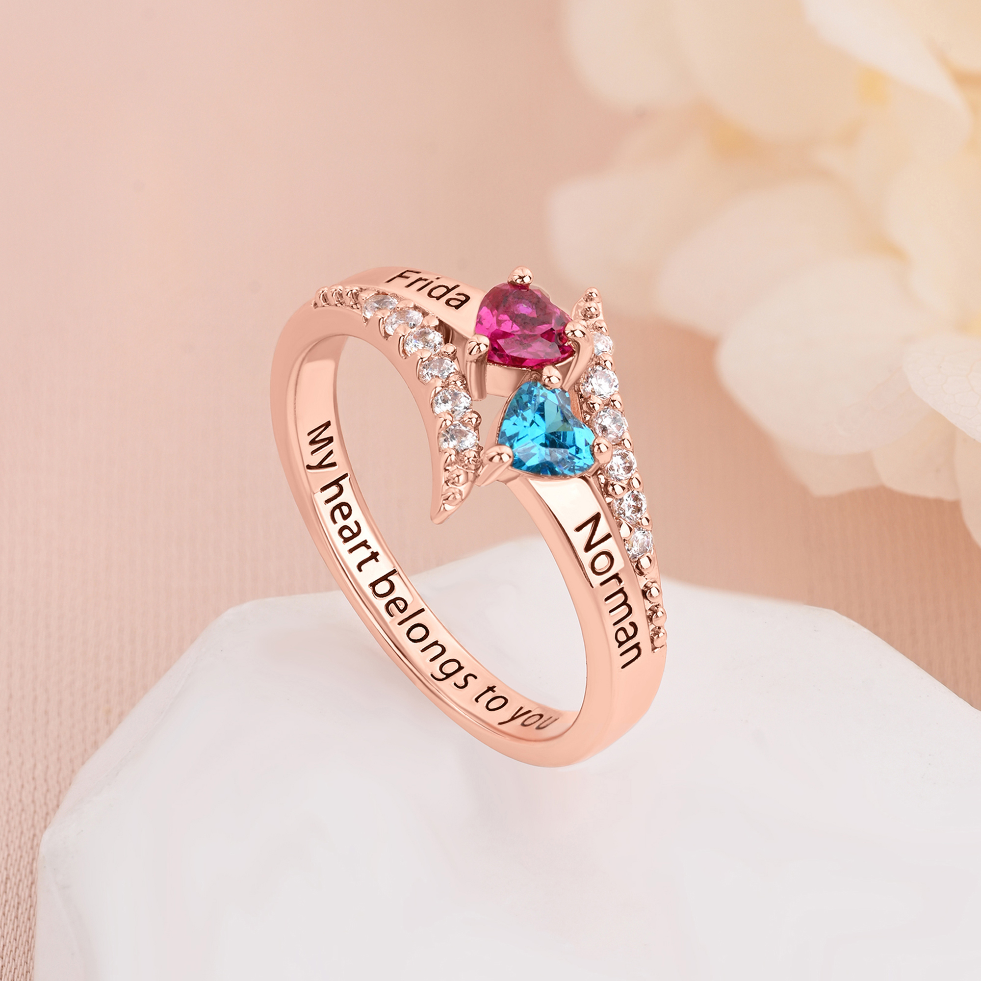 | Estilo | Anillo con doble corazón grabado a medida y piedras de nacimiento |