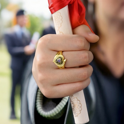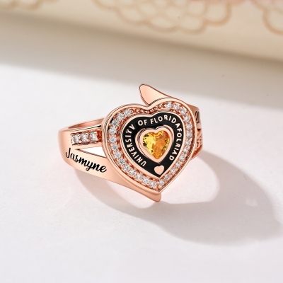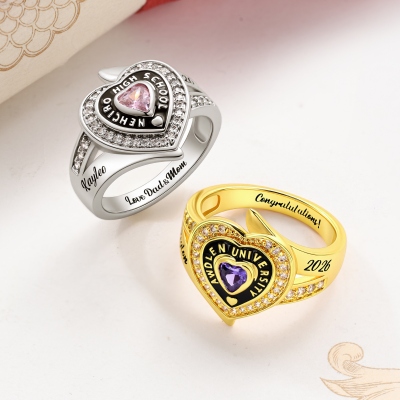 Elegante anillo de graduación : Este anillo luce una elegante banda con una piedra natal en forma de corazón en el centro, realzada por brillantes circonitas cúbicas. Refleja éxito y dedicación, ofreciendo un símbolo significativo para conmemorar un hito importante.