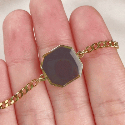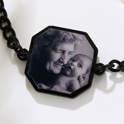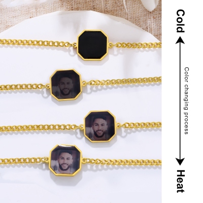Diseño de Imagen Secreta : Esta pulsera octagonal con dijes combina ingeniosamente la tecnología termorreactiva con la personalización. Su elegante cadena se siente refinada y discreta, mientras que el panel fotográfico termosensible permanece discreto hasta que se calienta al tacto, revelando lentamente una imagen oculta, como si un momento íntimo cobrara vida. La parte trasera está rematada con un fino grabado de texto, que añade un toque de individualidad y detalle.