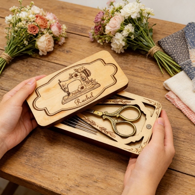 Grabado láser floral : cada estuche presenta intrincados bordes de flores silvestres que rodean un motivo central de estilo vintage (a elegir entre máquina de coser, colmena, mariposa o corona floral), grabados con precisión en la superficie de la madera para lograr una elegancia duradera y una profundidad visual.