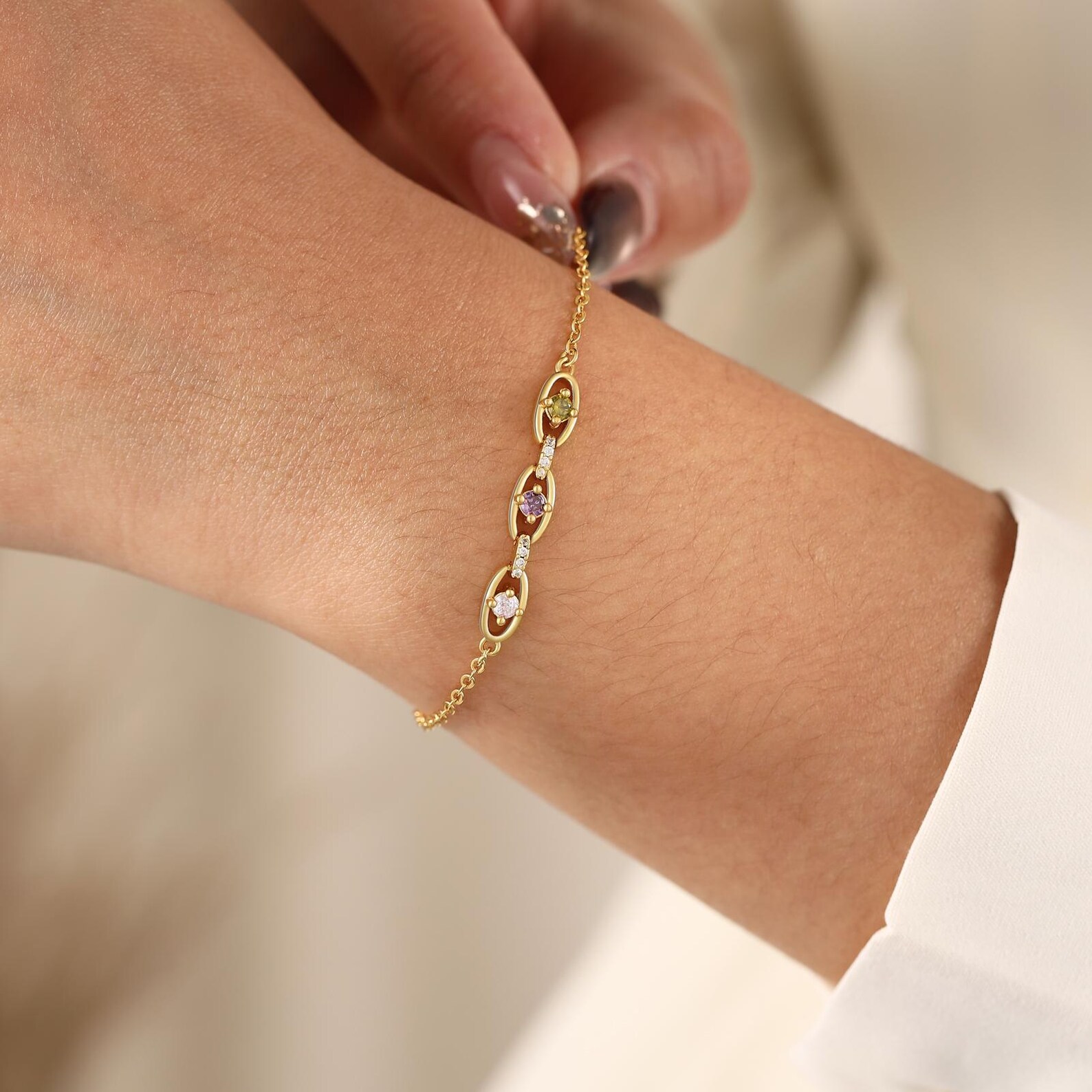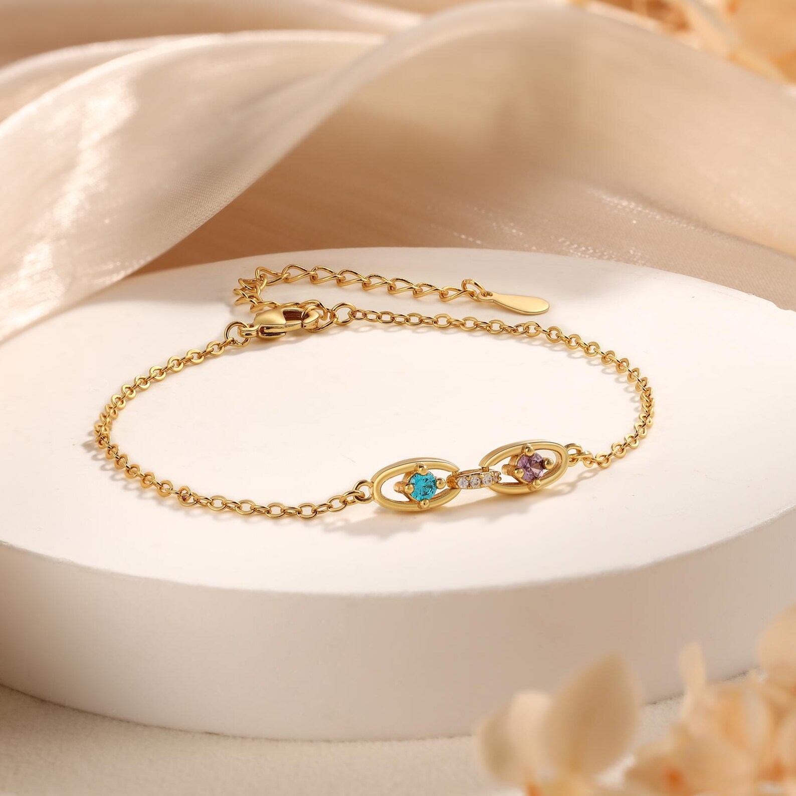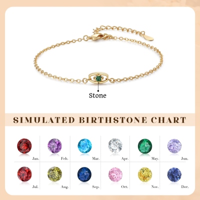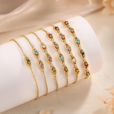 Elegante diseño de piedra de nacimiento y ojo turco : Esta delicada pulsera presenta una elegante cadena adornada con hasta seis eslabones ovalados, cada uno con una colorida piedra de nacimiento que representa el mes de nacimiento de sus seres queridos. Un sutil dije de ojo turco añade un toque de simbolismo protector, que se cree que aleja la negatividad y atrae la buena fortuna.