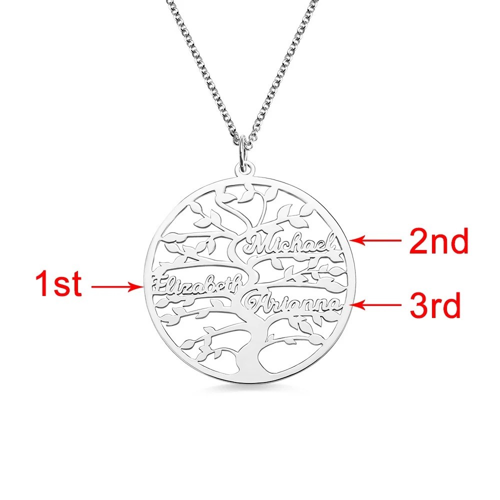 El árbol es el símbolo permanente de la vida y la continuación del amor entre las familias. El collar del árbol genealógico representa el amor inquebrantable y la conexión entre la familia, al igual que un árbol y su rama en crecimiento. Este collar con 1-13 nombres consiste en la mejor manera de mostrar su amor a todos los miembros de su familia o amigos. Es joya familiar perfecta para mamá y abuela con significado conmemorativo y sentimental. Emocionada, la familia sipiempre mantiene una relación estrecha.
