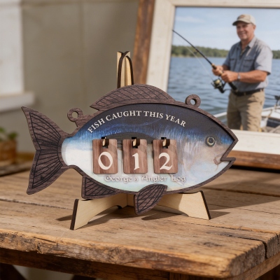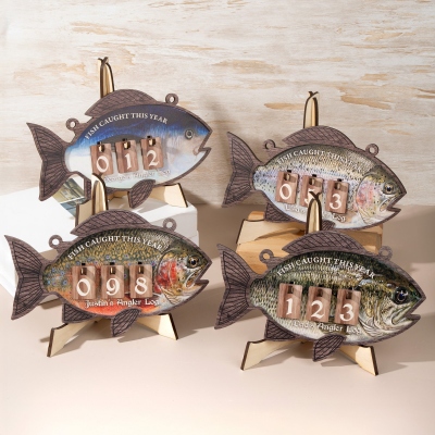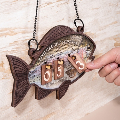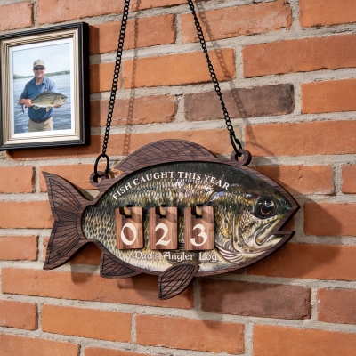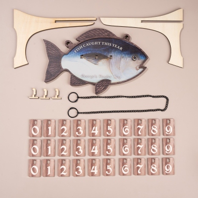 Diseño personalizado : este cartel de madera, con forma de pez, muestra cuatro ilustraciones realistas de peces sobre un fondo rústico con vetas de madera, e incluye etiquetas numeradas intercambiables para registrar las capturas. La frase fija "Pescado capturado este año" se combina con un nombre personalizado, convirtiéndolo en un recuerdo personal e inolvidable.