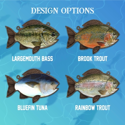 | Estilo | Letrero colgante personalizado con la frase "Pescado capturado este año" y su nombre. |