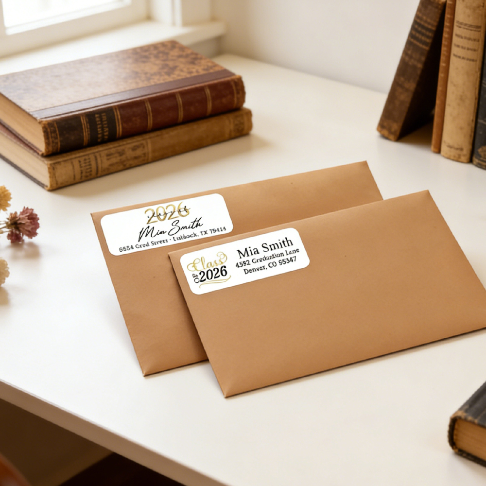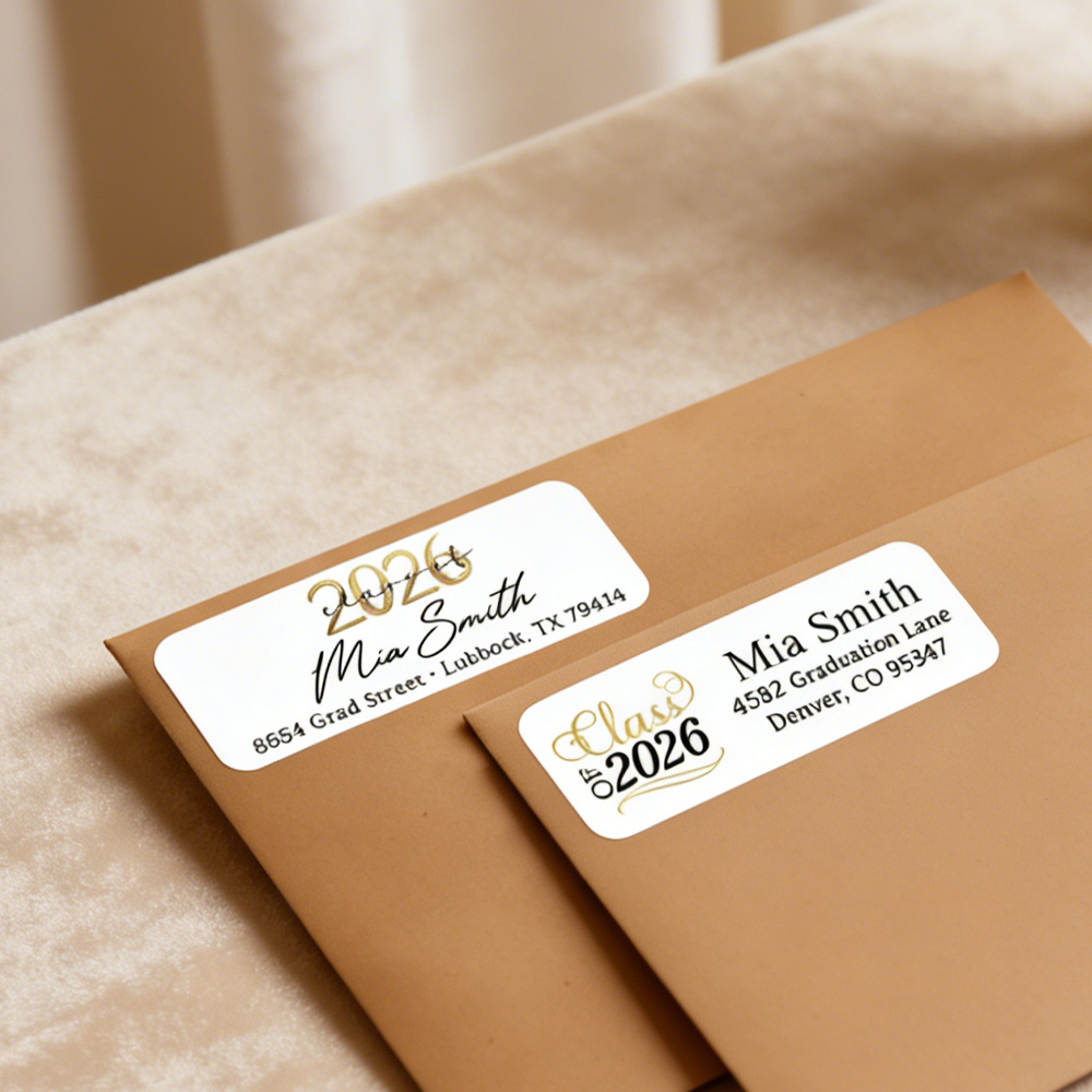 Elegante etiqueta para la promoción de 2026 : una etiqueta refinada con la inscripción "Clase de 2026" escrita a mano en letra cursiva dorada, combinada con una tipografía limpia y moderna para el nombre y la dirección, logrando un equilibrio entre celebración y sofisticación en la correspondencia de cada graduado.