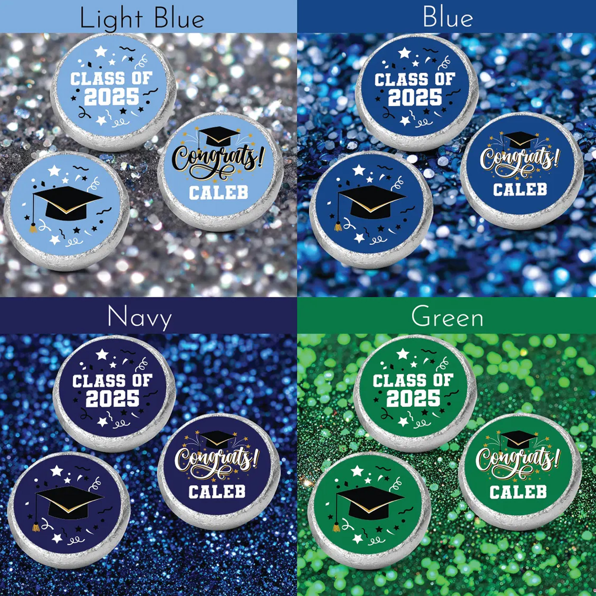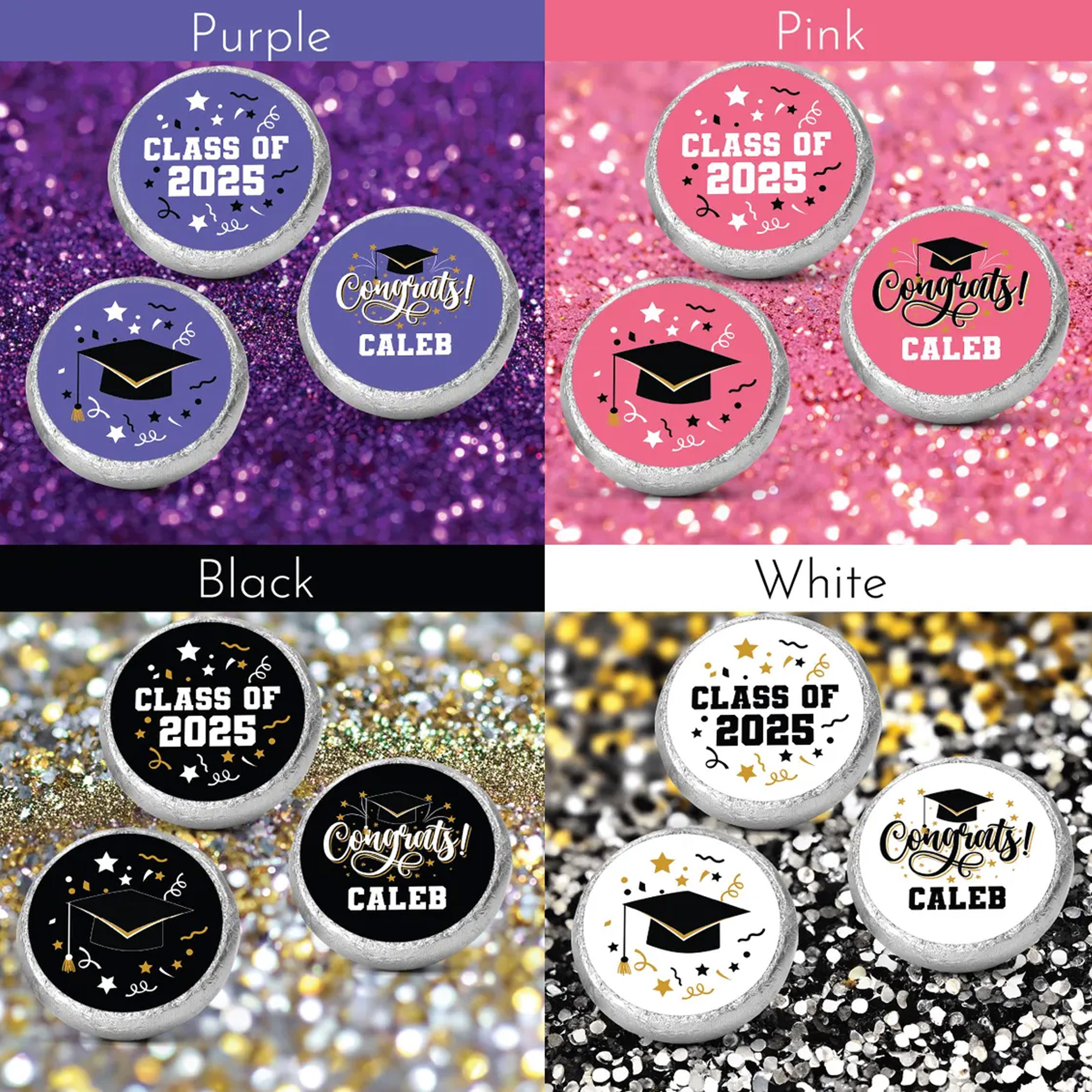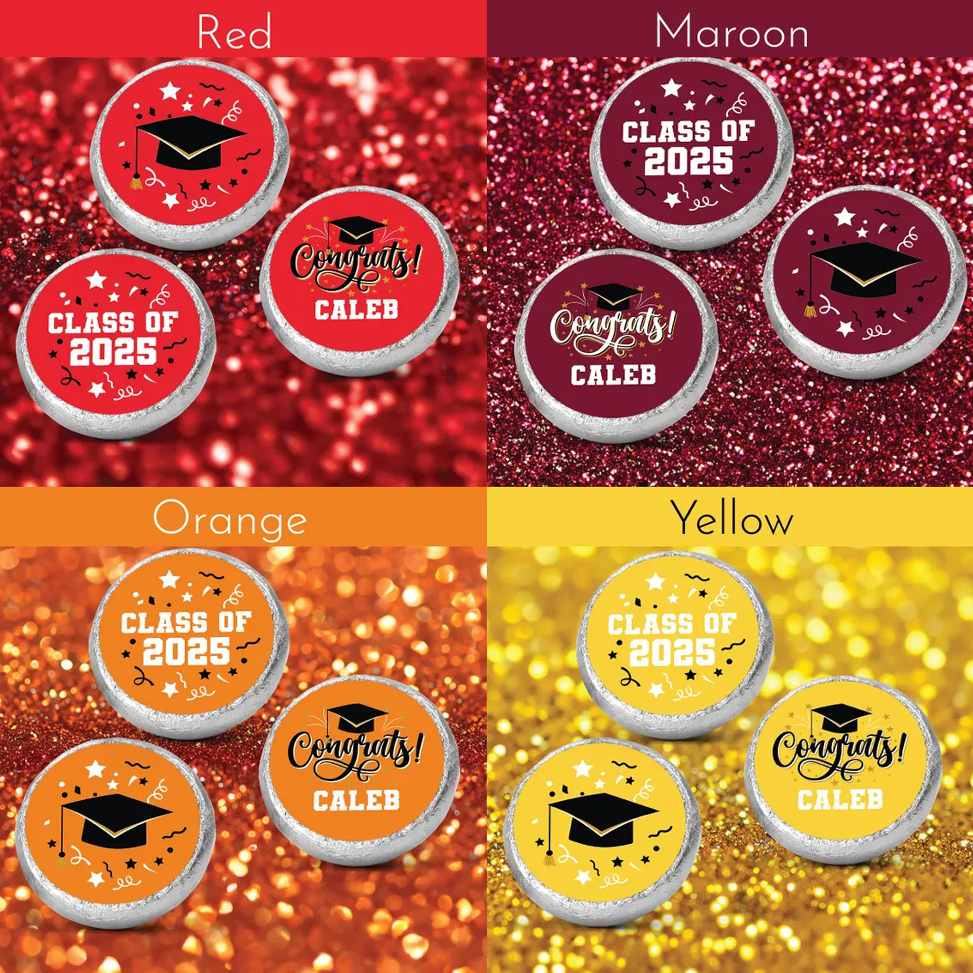 Tamaño perfecto para chocolates : estas pegatinas redondas en miniatura están cortadas con precisión para envolver chocolates similares envueltos en papel de aluminio, sin que sobresalgan ni queden huecos. Elige entre colores clásicos que combinen con la temática de tu graduación.