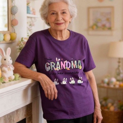 Diseño de Conejito de Pascua : Esta camiseta presenta una hilera de coloridos conejitos de Pascua con la conmovedora frase "La abuela ama a sus conejitos". El divertido diseño del conejito aporta un ambiente cálido y alegre de Pascua, mientras que el suave estampado multicolor le da un toque adorable y alegre que destaca en cualquier reunión familiar.
