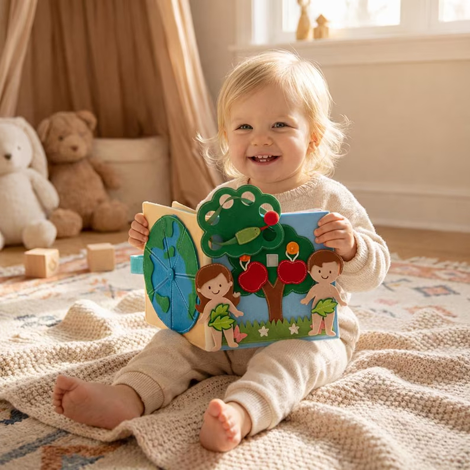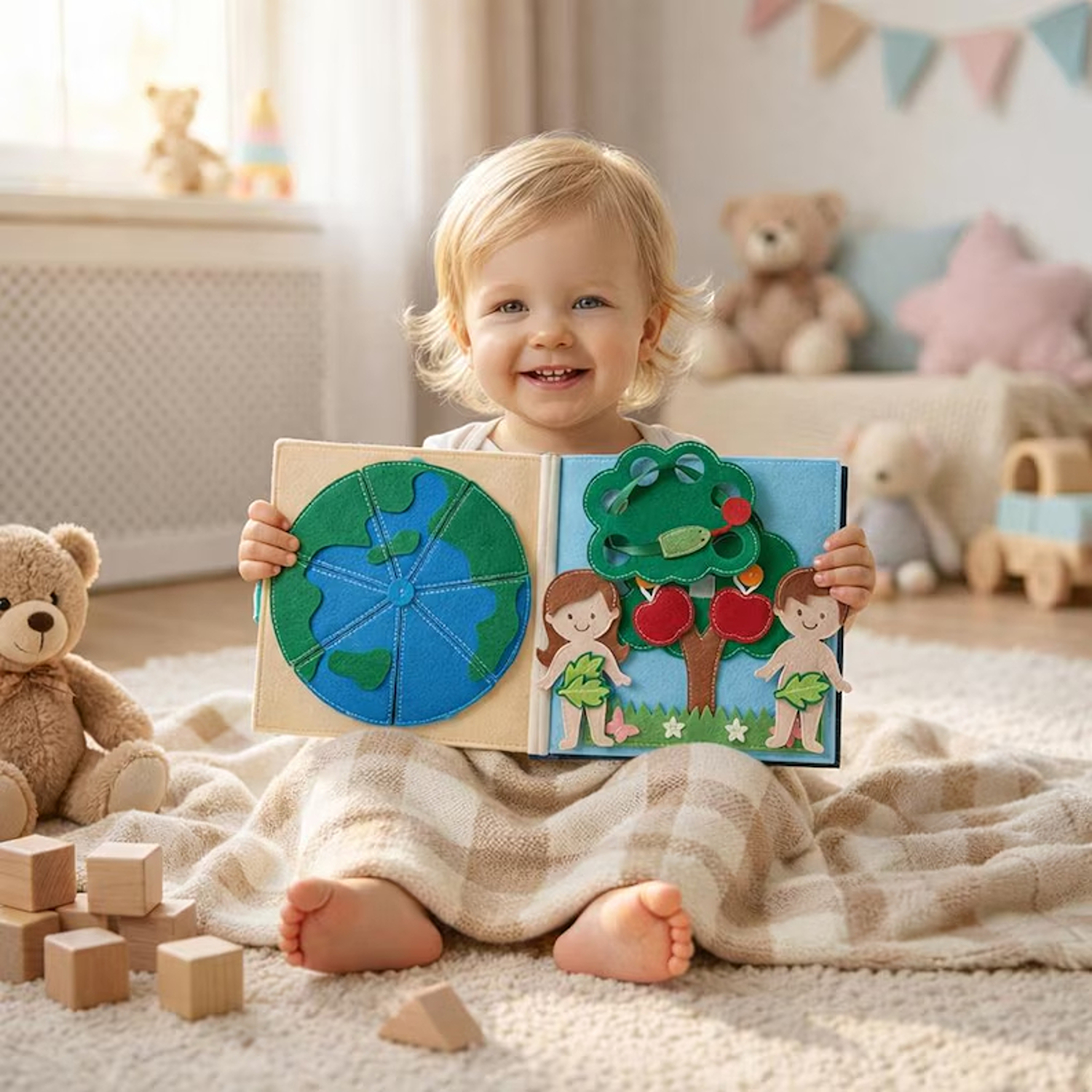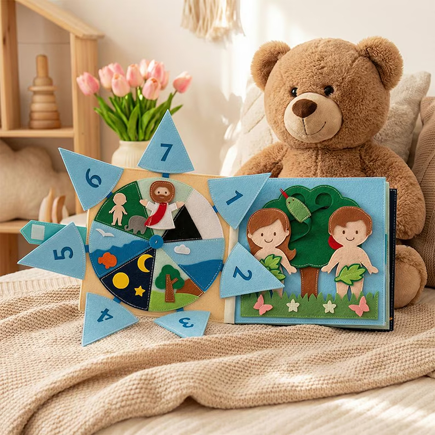 Libro Bíblico Silencioso de Fieltro : Un libro de actividades de fieltro hecho a mano que presenta 7 escenas bíblicas apacibles (la Tierra, el Jardín del Edén y elementos simbólicos), diseñado para la exploración tranquila, el aprendizaje táctil y el descubrimiento temprano de la fe.