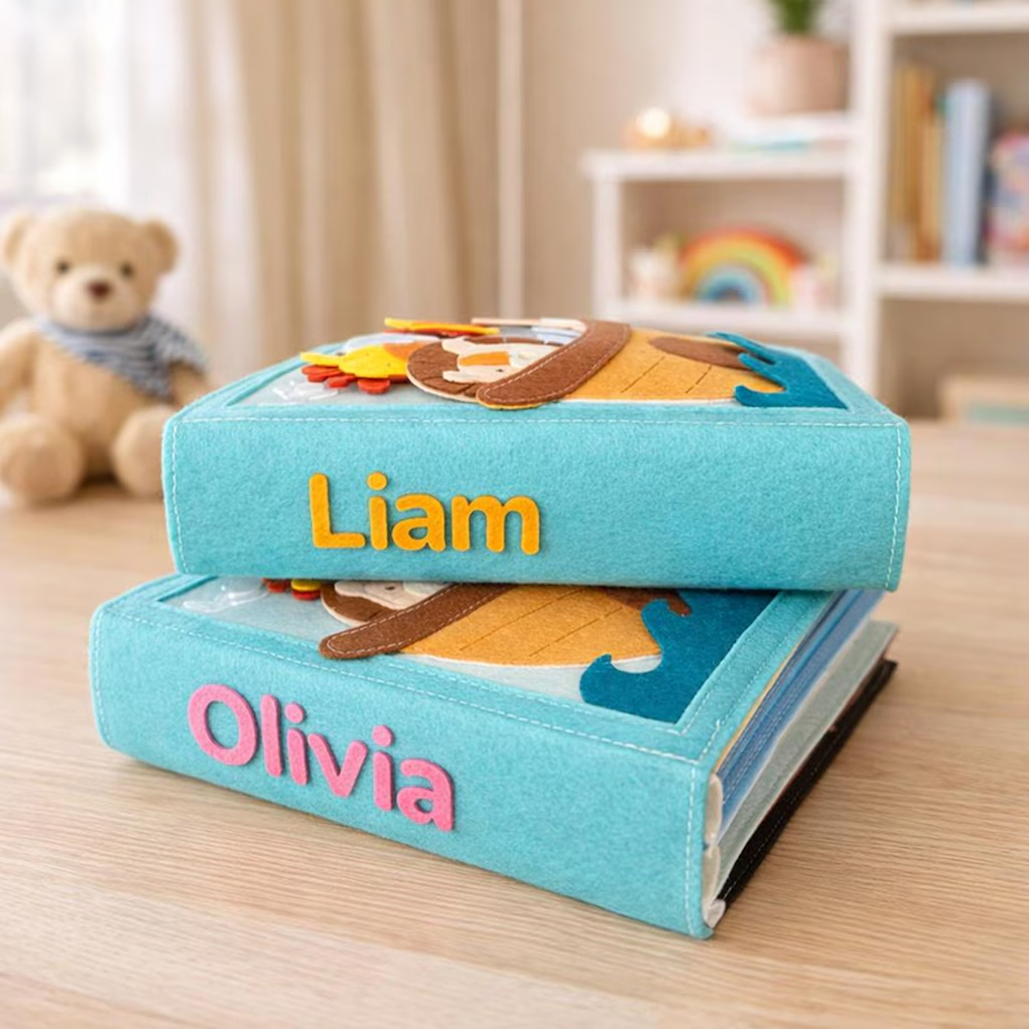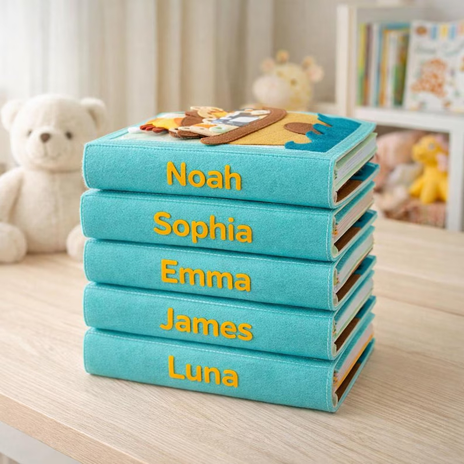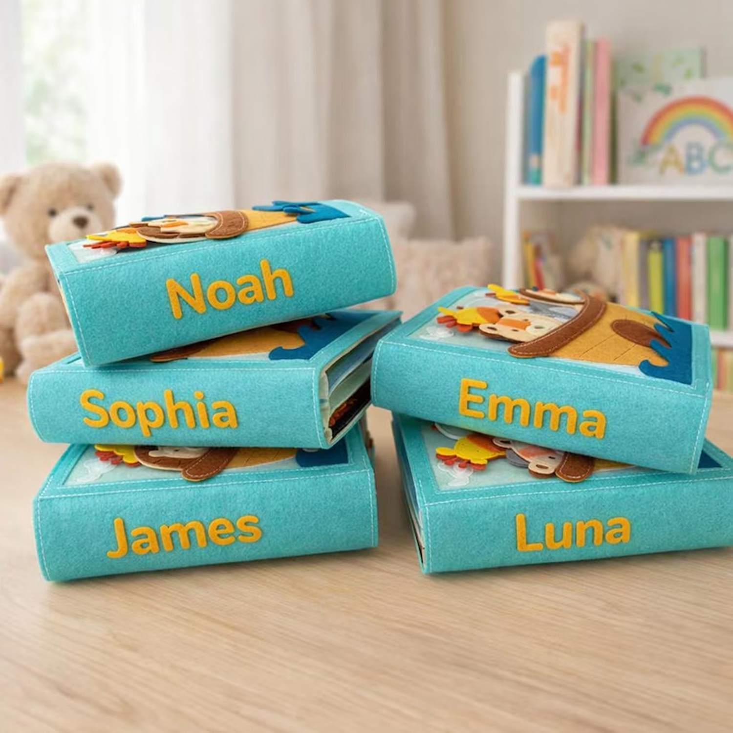 Nombre personalizado : Cada libro se personaliza con el nombre del niño bordado sutilmente en el lomo, convirtiéndolo en un recuerdo preciado que crece con él desde la primera infancia hasta la niñez temprana.