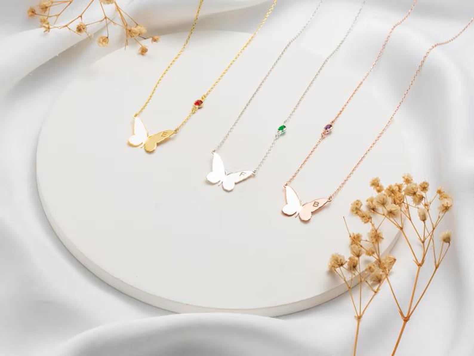 | Estilo | Collar de mariposa personalizado con inicial y piedra de nacimiento |
