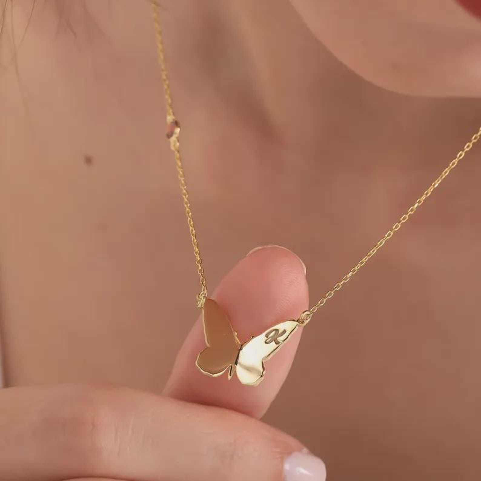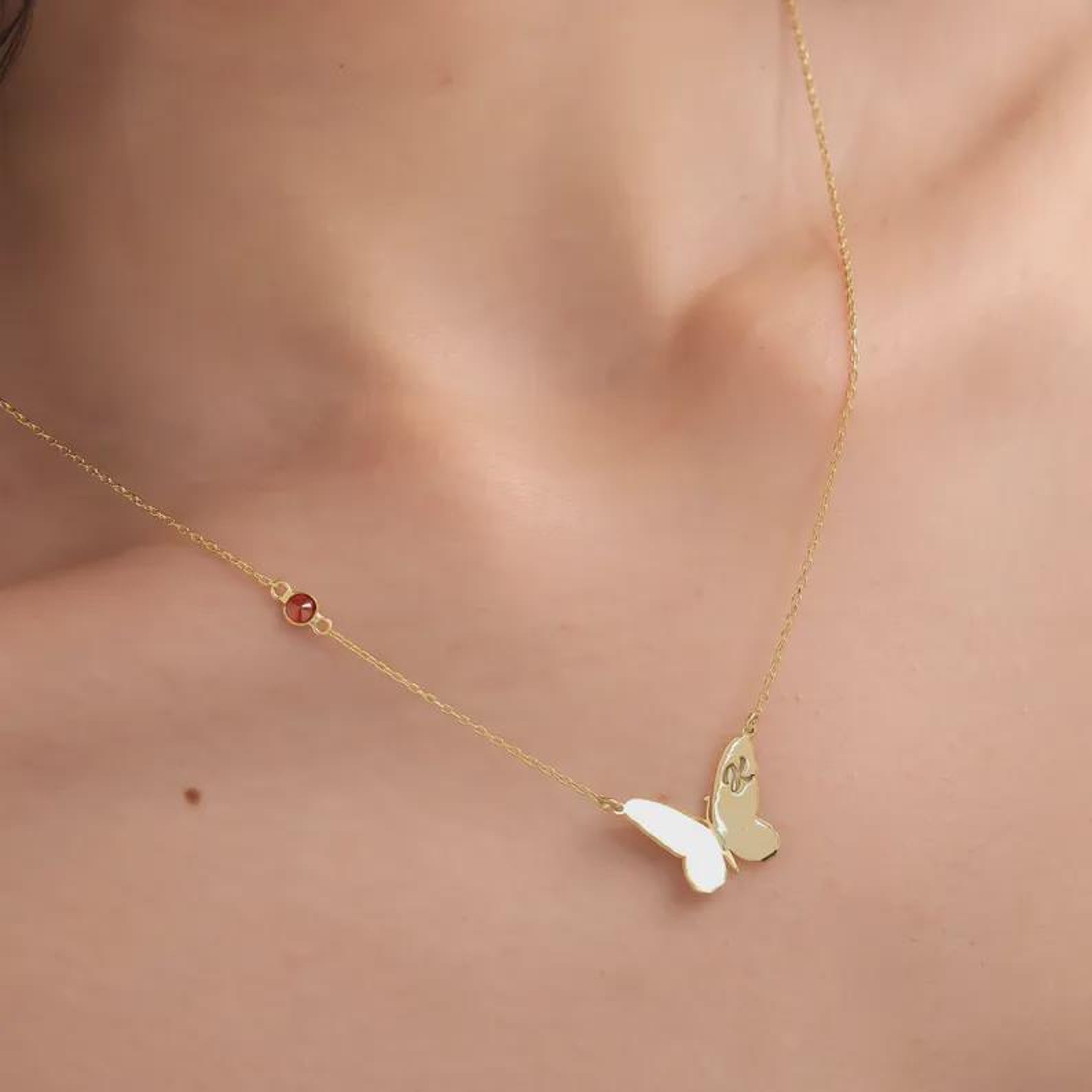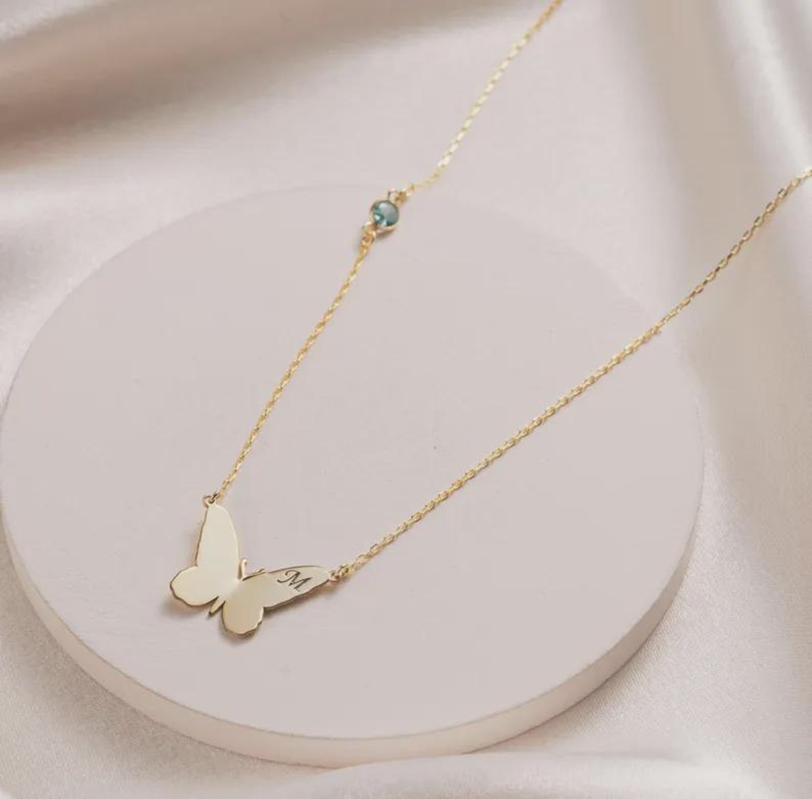 Inicial y piedra de nacimiento personalizables : Personaliza el collar con una inicial grabada en una de las alas de la mariposa, añadiendo un toque especial que representa a quien lo lleva o a un ser querido. Una pequeña piedra de nacimiento redonda está delicadamente engastada a lo largo de la cadena, realzando su valor sentimental y añadiendo un sutil toque de color que refleja el mes de su cumpleaños.