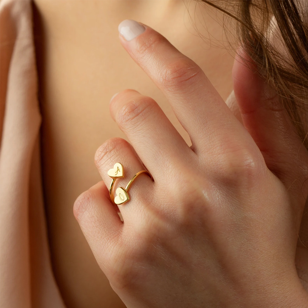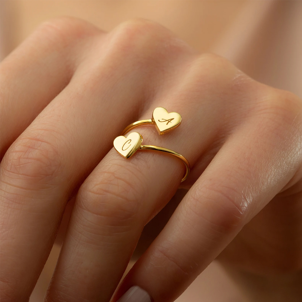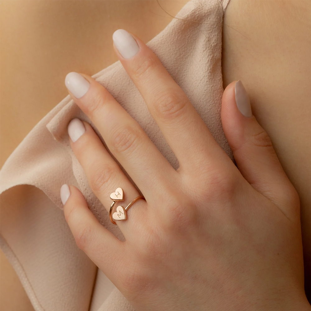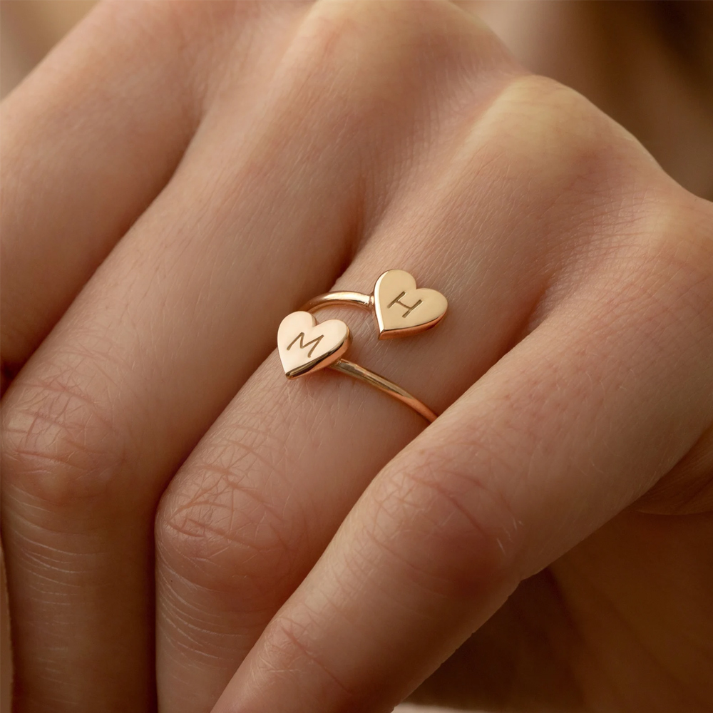 Encantador diseño de doble corazón : Este delicado anillo apilable presenta dos pequeños dijes en forma de corazón, cada uno grabado con una inicial personalizada. Los corazones están unidos por una fina y elegante banda que rodea el dedo con gracia, creando un look romántico y atemporal.