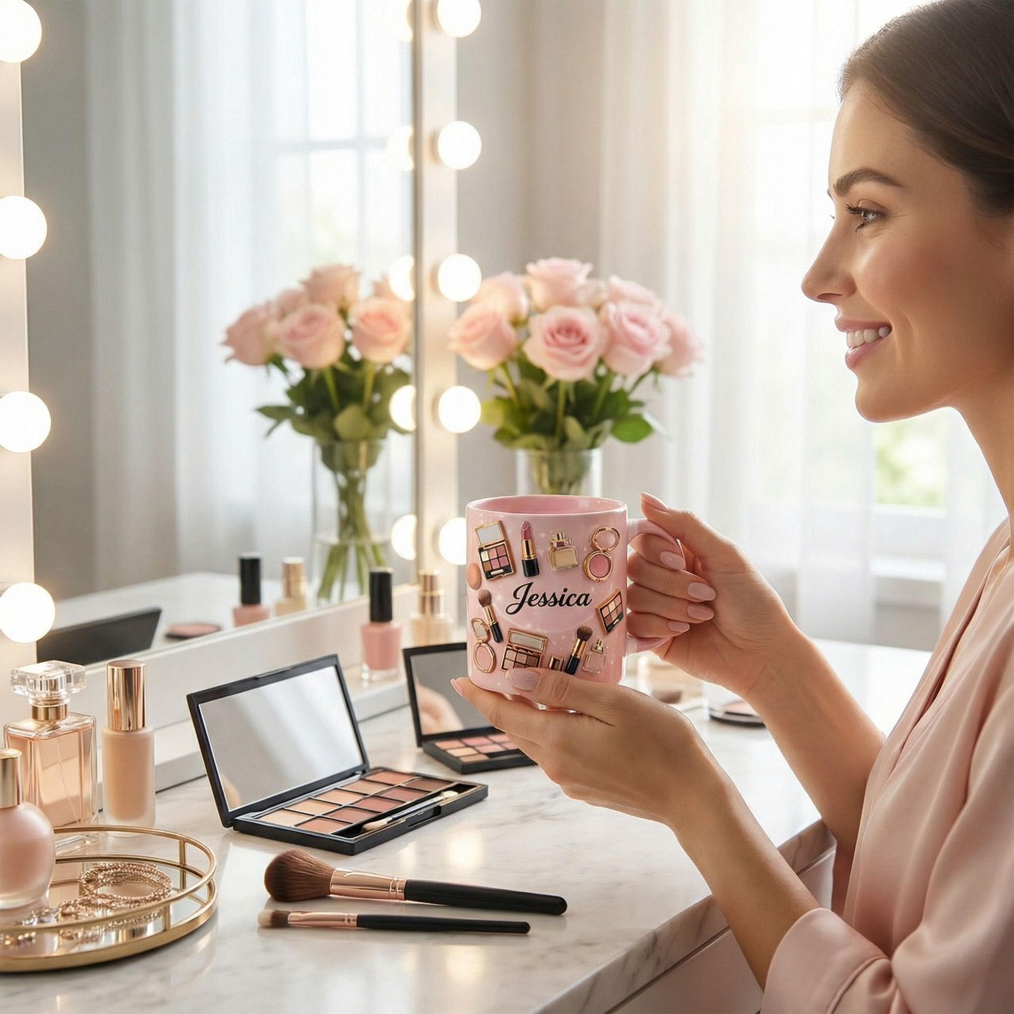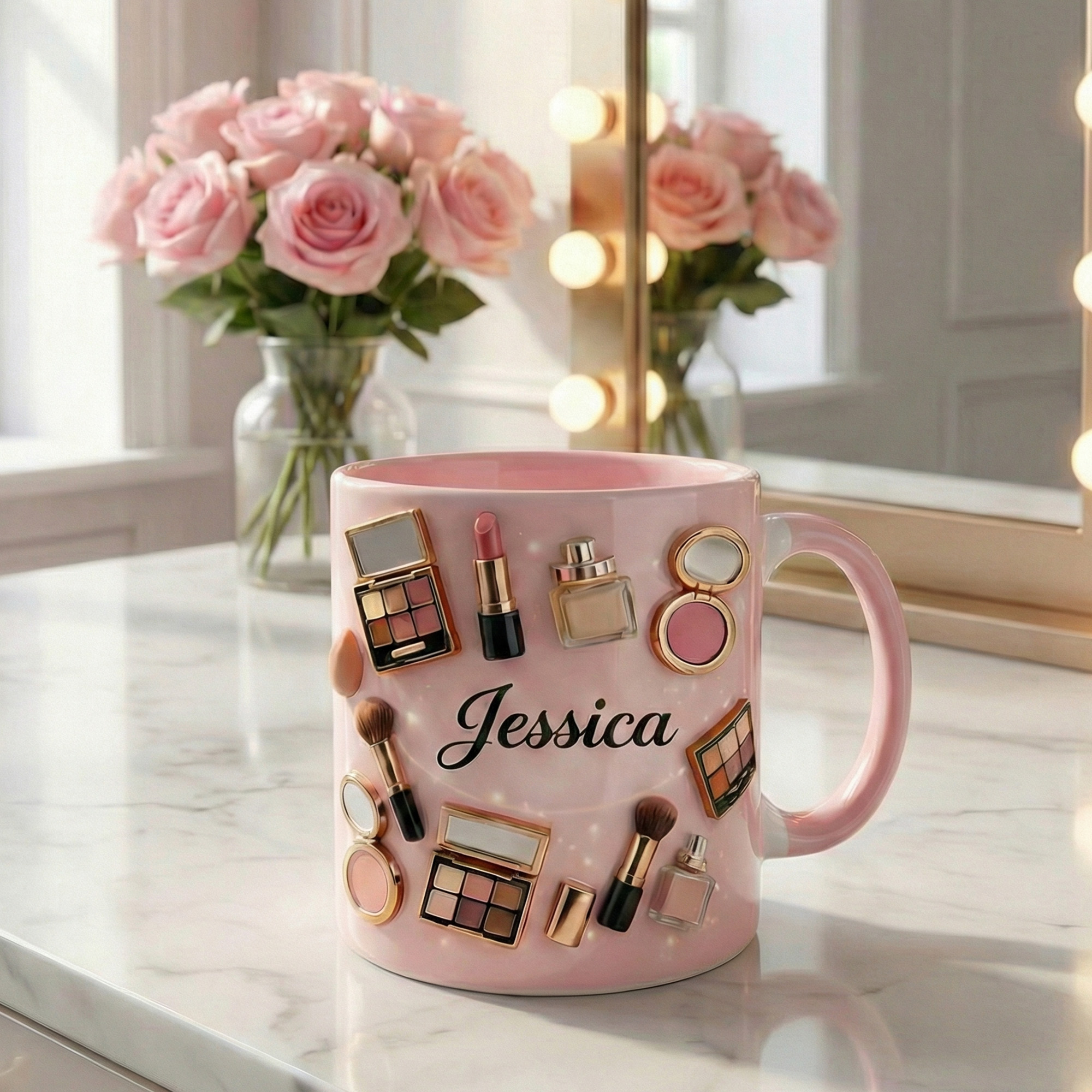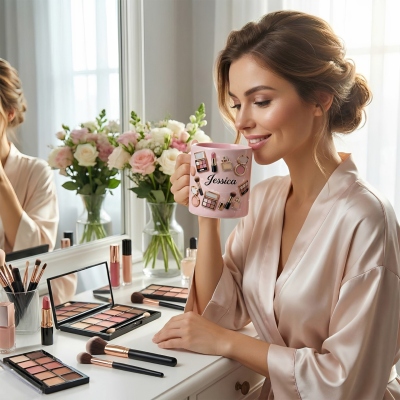 | Estilo | Taza personalizada con temática de maquillaje y nombre |