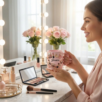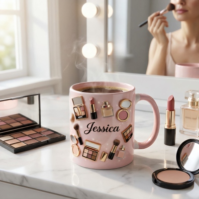 Taza de Maquillaje : Una elegante taza de cerámica adornada con iconos de maquillaje en 3D, como labiales, paletas y pinceles. Es una opción divertida y moderna tanto para amantes de la belleza como para los amantes del café.