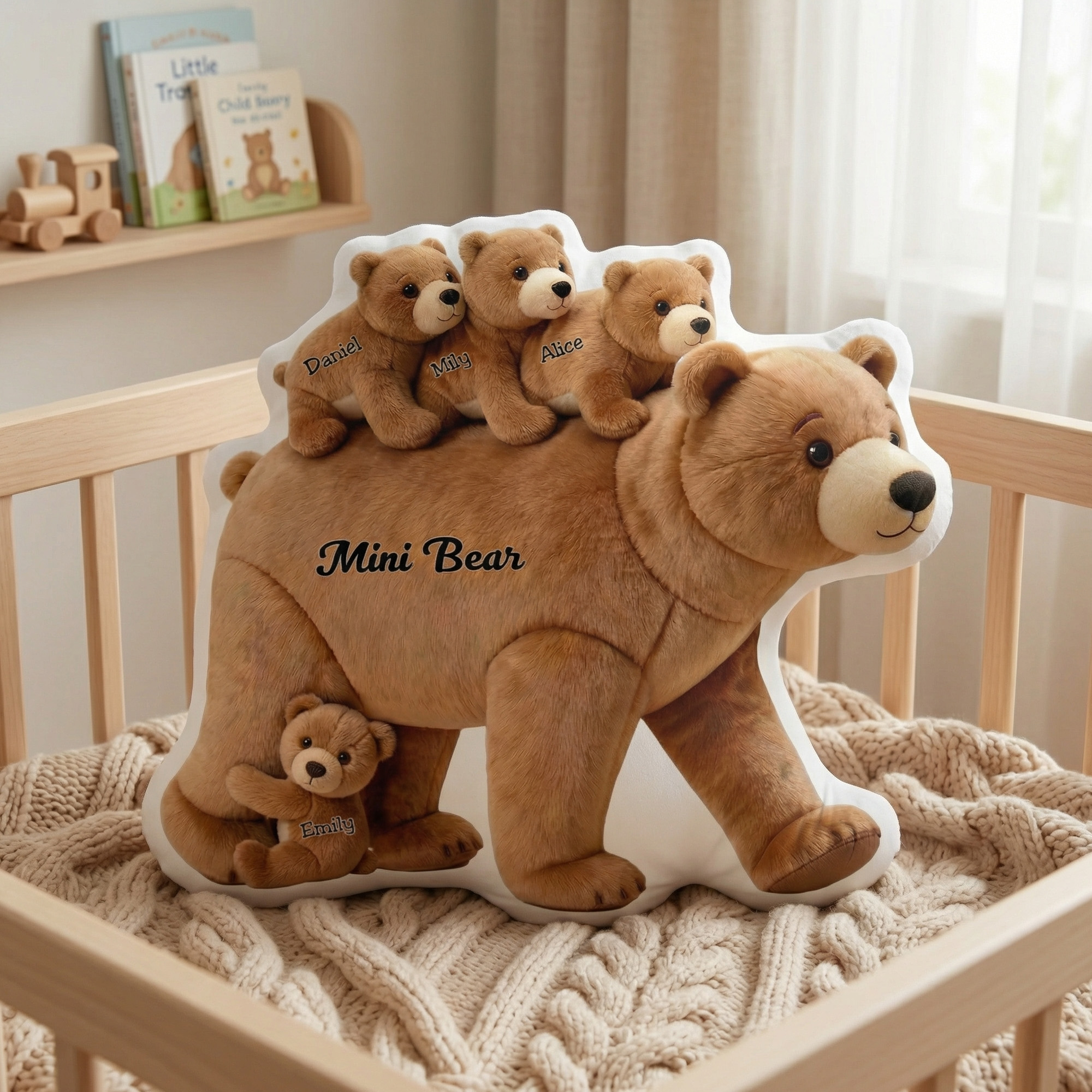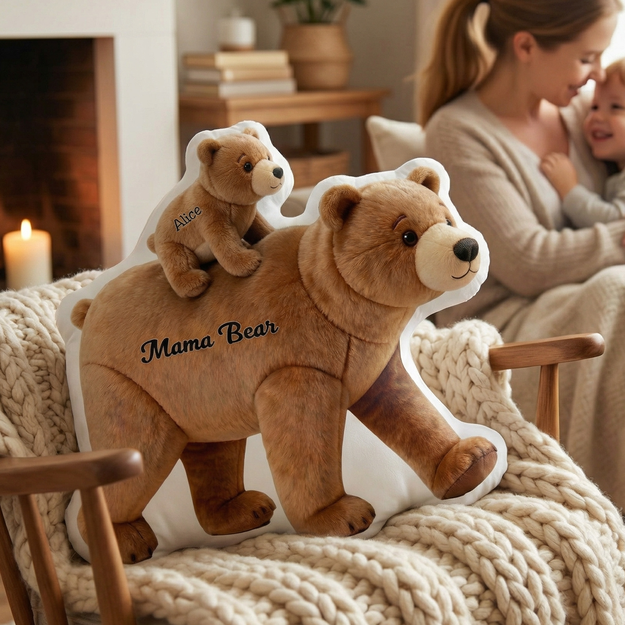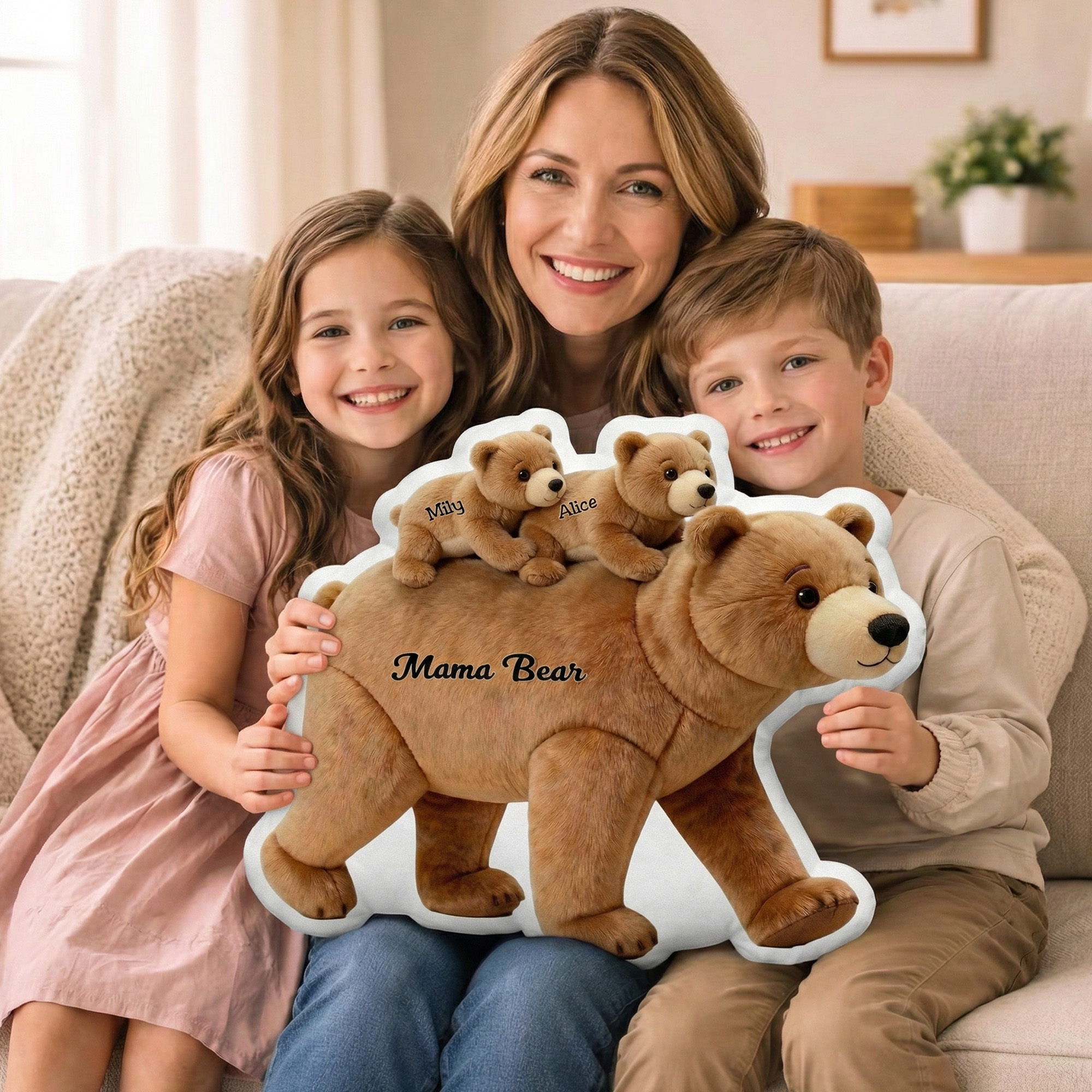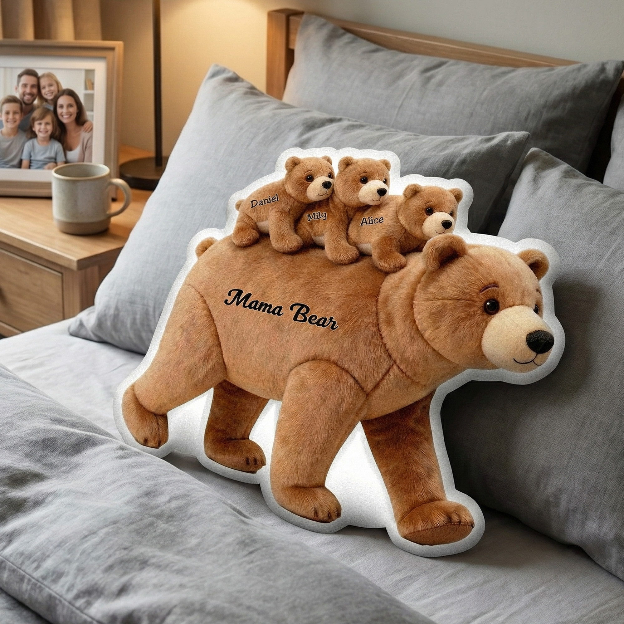 | Estilo | Cojín decorativo personalizado con forma de osa madre y cachorros con nombres. |