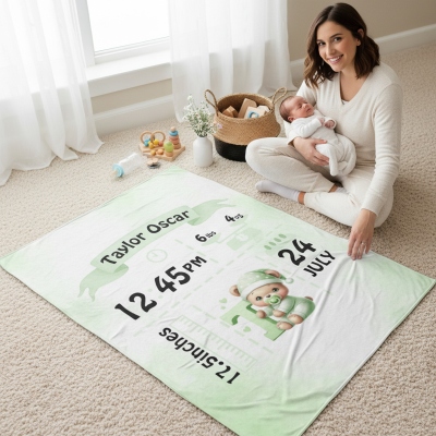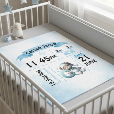 Detalles de nacimiento personalizados : La manta se puede personalizar con el nombre del bebé y sus datos de nacimiento, como fecha, hora, peso y longitud. Este toque personal convierte una simple manta en un recuerdo significativo que captura el momento especial en que un pequeño llegó al mundo.