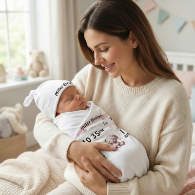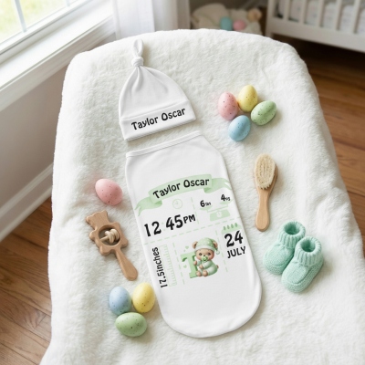 Estadísticas de nacimiento personalizadas : El set de arrullo se puede personalizar con el nombre y los detalles del nacimiento de tu bebé, convirtiendo un simple arrullo y gorro en un recuerdo significativo. Ofrece una forma especial de celebrar la llegada de un recién nacido y permite a los padres registrar esos primeros momentos especiales de una forma única y memorable.