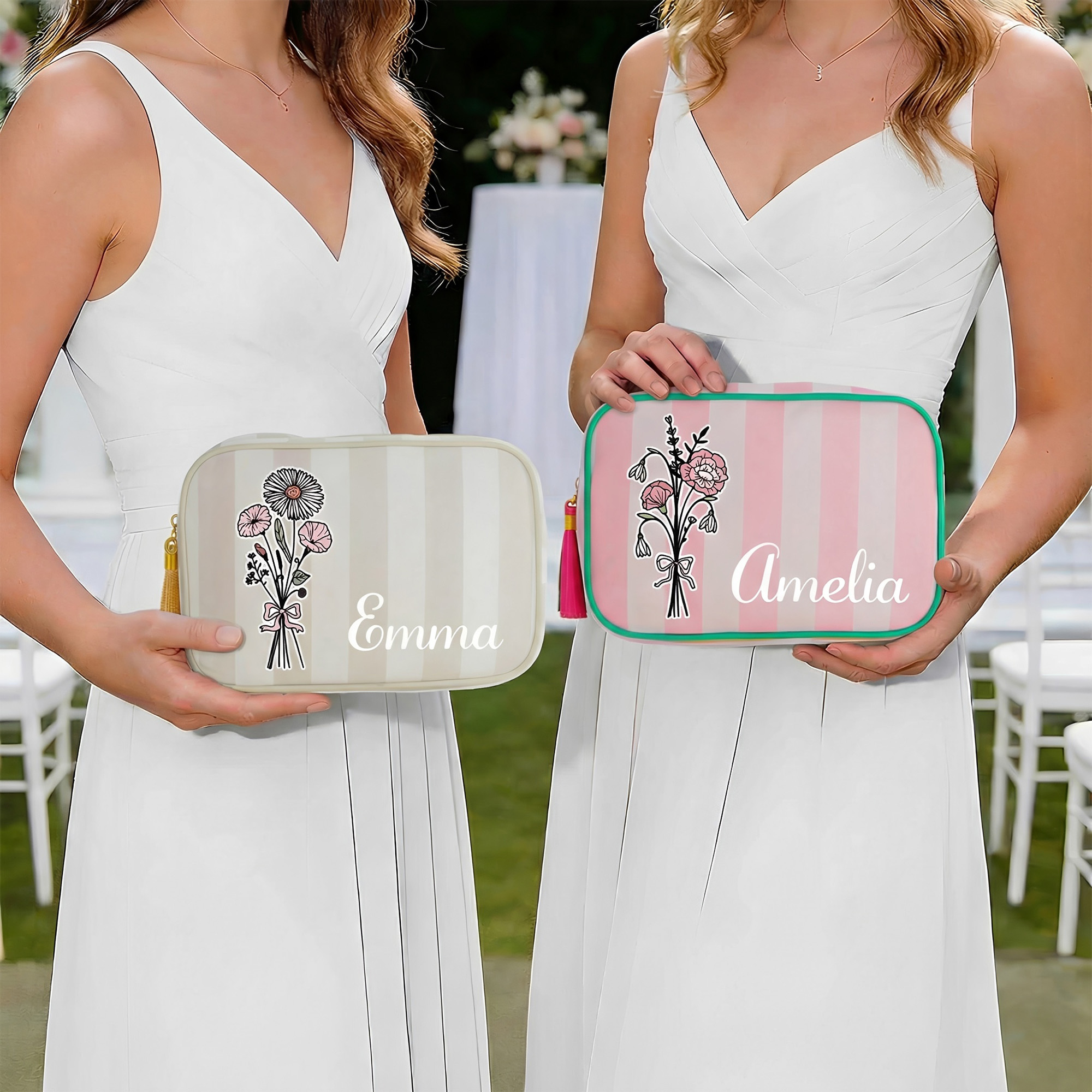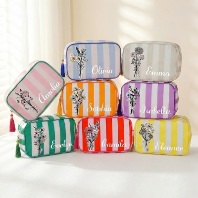 | Estilo | Neceser personalizado con nombre, ramo de flores de nacimiento, rayas y borla. |