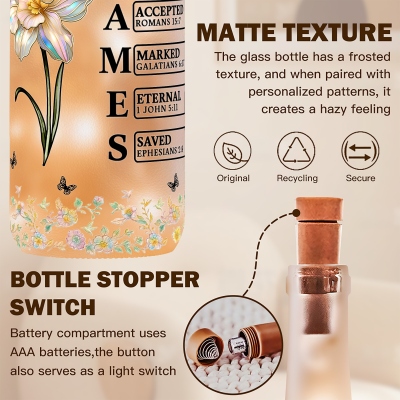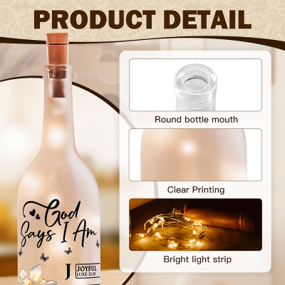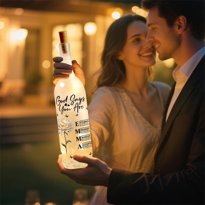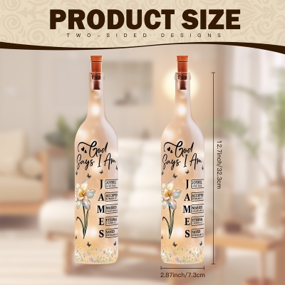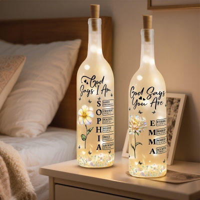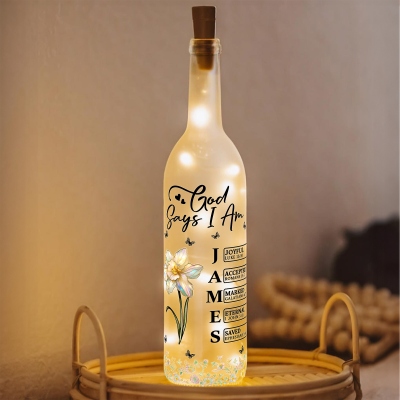 Diseño floral inspirado en la fe : esta lámpara nocturna con forma de botella de vino presenta una elegante ilustración de la flor de nacimiento junto con la inspiradora cita bíblica «Dios dice que yo soy/Dios dice que tú eres». Los delicados detalles de mariposas y la suave tipografía crean una imagen cálida y significativa que fusiona fe, aliento, fortaleza, naturaleza y una luz tenue.